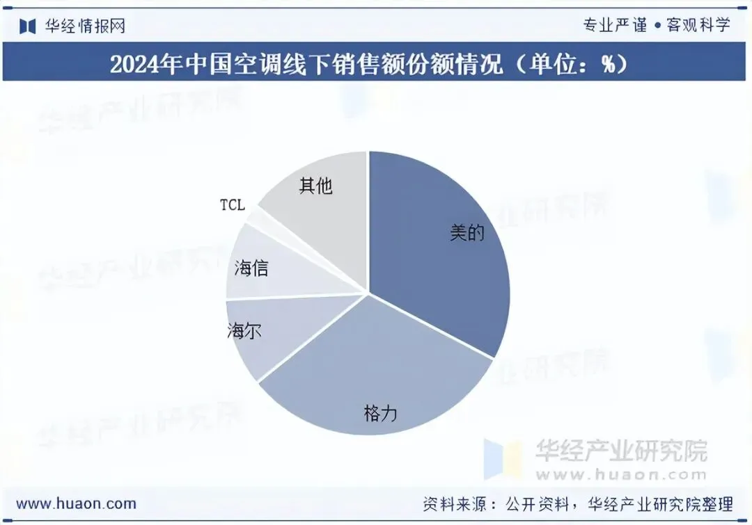 线下市场来看,空调市场头部阵营依旧稳固,格力、美的、海尔等传统一线品牌凭借深厚底蕴,牢牢占据市场主导地位,市场份额总和超半数。美的以多元化业务与全球化布局展现规模效应,2024年线下市场份额占比33.1%;格力则凭借技术与品牌积淀,在线下具备强大号召力,在高端产品领域优势明显,2024年线下市场份额占比25.1%。