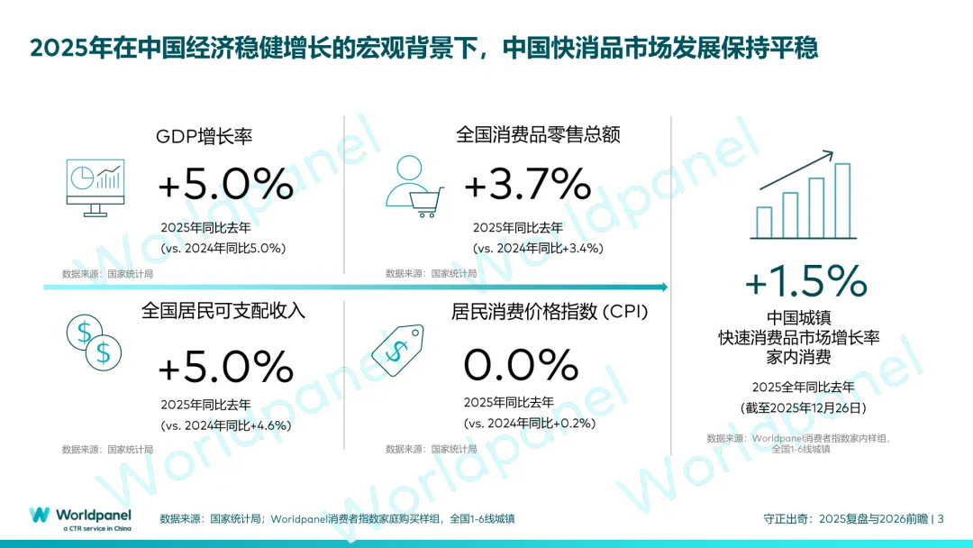 宏观经济支撑:2025年中国GDP同比增长5.0%(与2024年持平);全国消费品零售总额同比增长3.7%(较2024年3.4%小幅提升);全国居民可支配收入同比增长5.0%(高于2024年4.6%),为快消市场增长奠定基础。 物价水平平稳:2025年居民消费价格指数(CPI)同比增长0.0%,较2024年0.2%的涨幅略有回落,物价稳定为消费市场平稳运行提供保障。 快消市场增长:全国1-6线城镇家内快消品市场2025年全年同比增长1.5%,在宏观经济稳健背景下保持平稳发展态势。