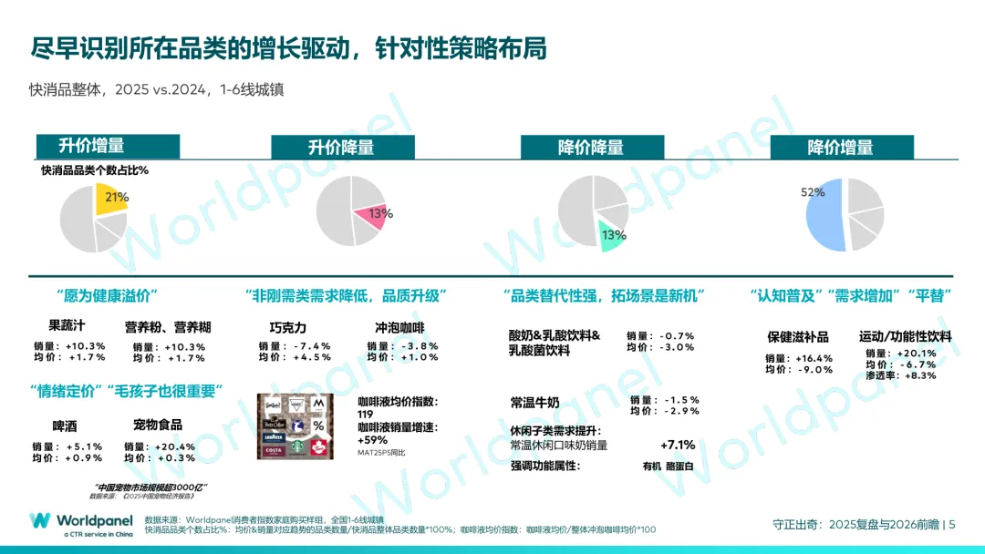 2025年快消品品类增长驱动呈现多元特征,按价格策略与销量变化可分为四类:升价增量(占比21%)、升价降量(占比13%)、降价增量(占比52%)、降价降量(占比13%)。 降价增量品类占比最高(52%),反映出价格仍是影响多数快消品类销量的关键因素;升价增量品类占比达21%,表明部分品类可通过品质升级、功能创新等实现提价且销量增长,如健康相关品类。