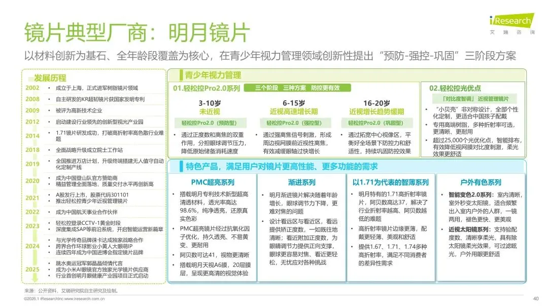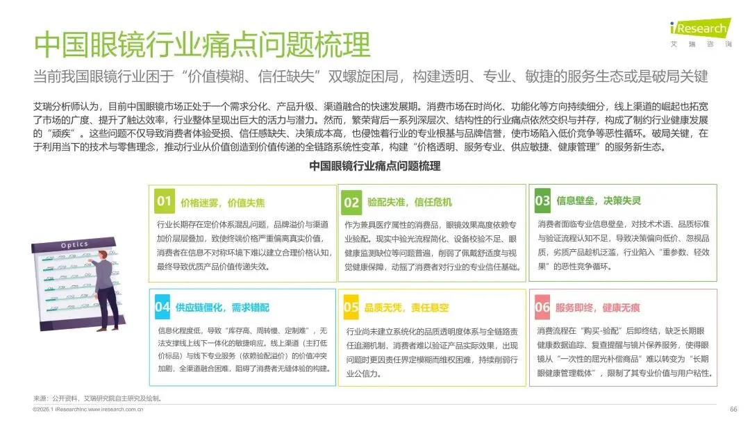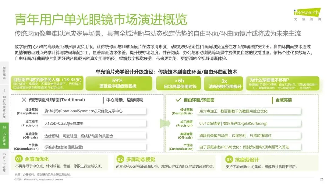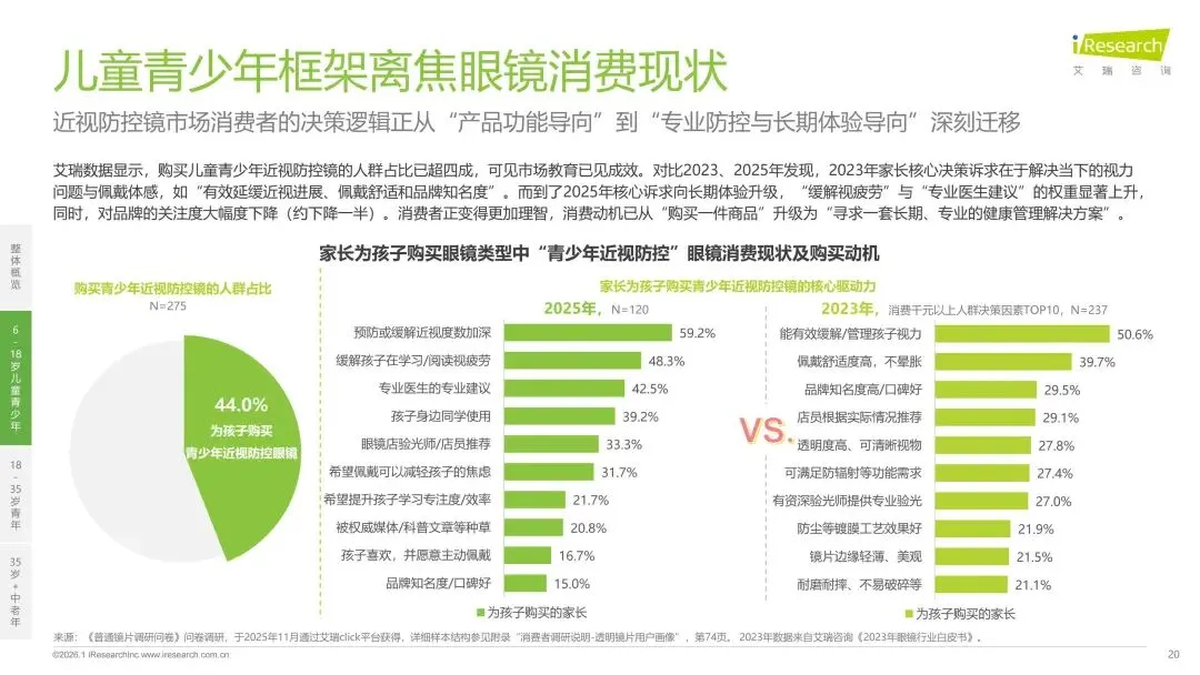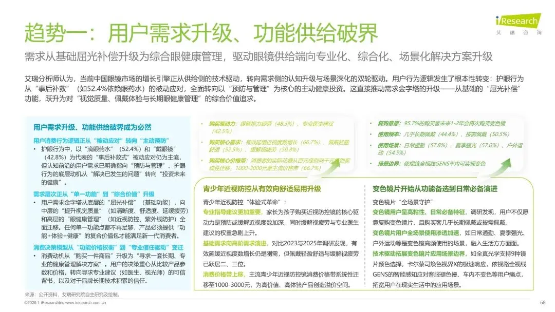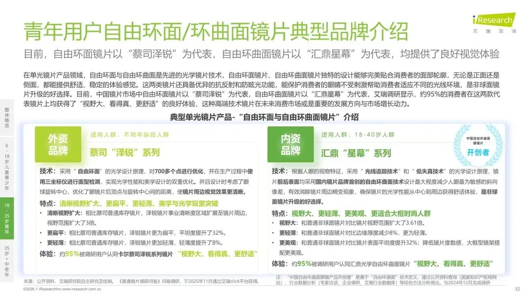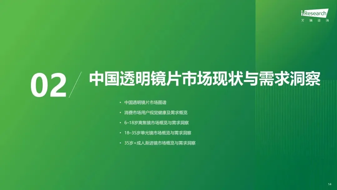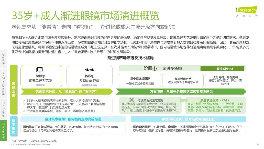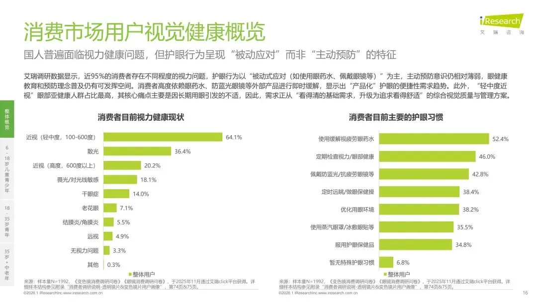 报告分别聚焦于透明镜片与变色镜片两大核心市场,详细梳理了针对儿童青少年、职场青年及中老年等不同人群的细分产品发展现状、技术演进路径、消费者需求洞察与市场趋势。最后,报告提炼出当前行业在价格、信任、服务等方面面临的共性痛点,并展望了未来在产品功能、专业服务、国牌崛起及产业融合等方面的重要发展趋势。本报告旨在为眼镜行业从业者、投资者及相关人士提供全面的市场洞察与决策参考。