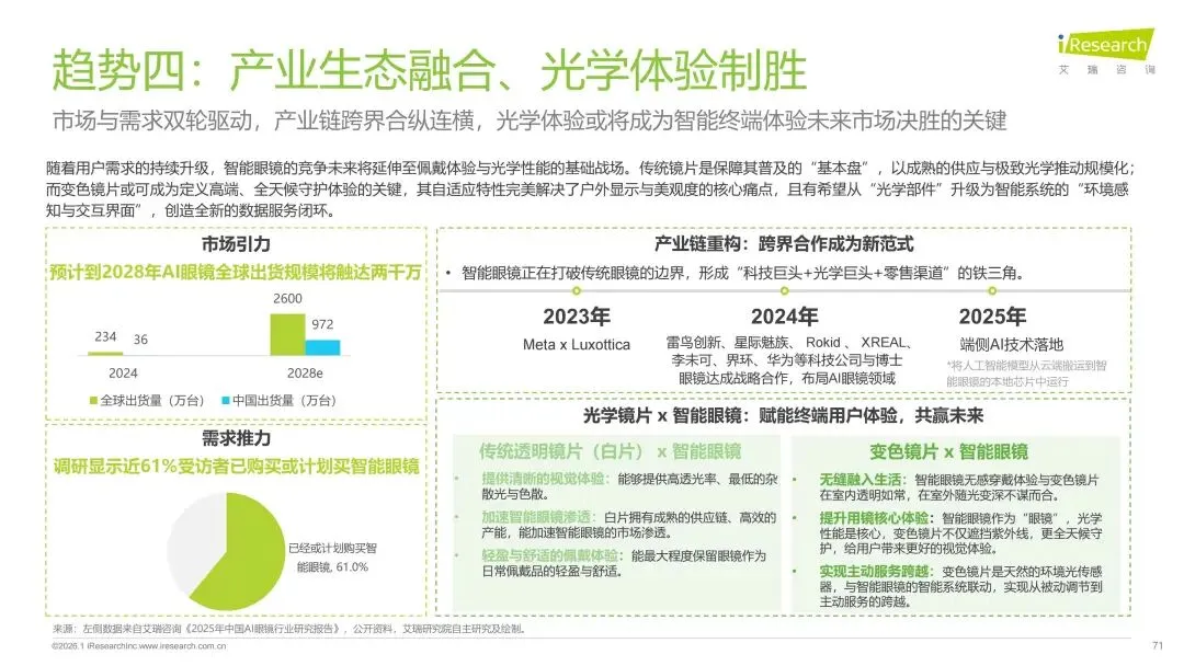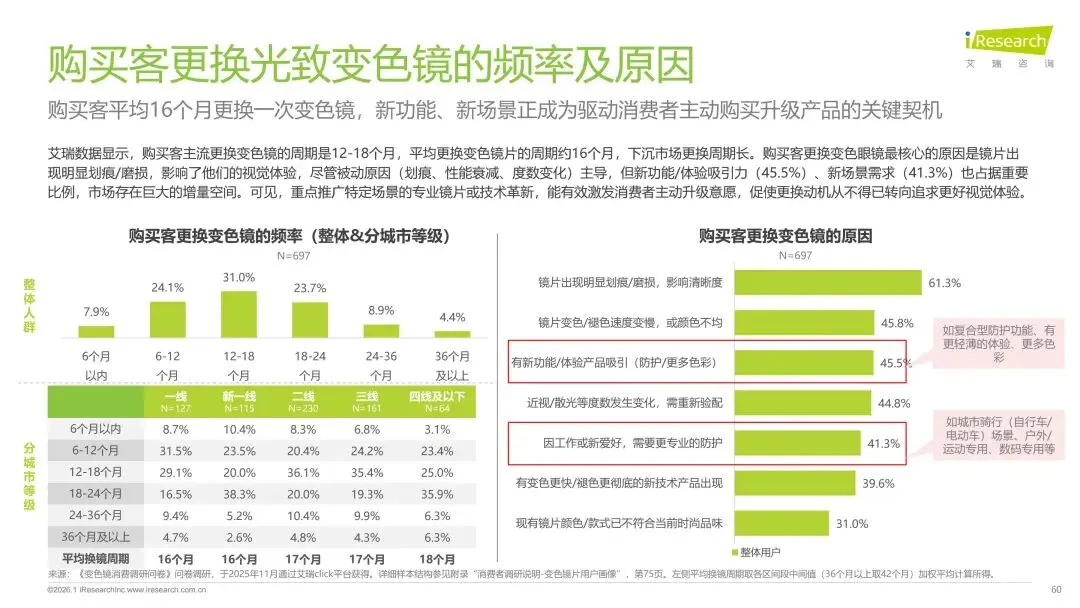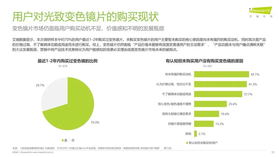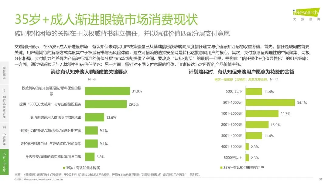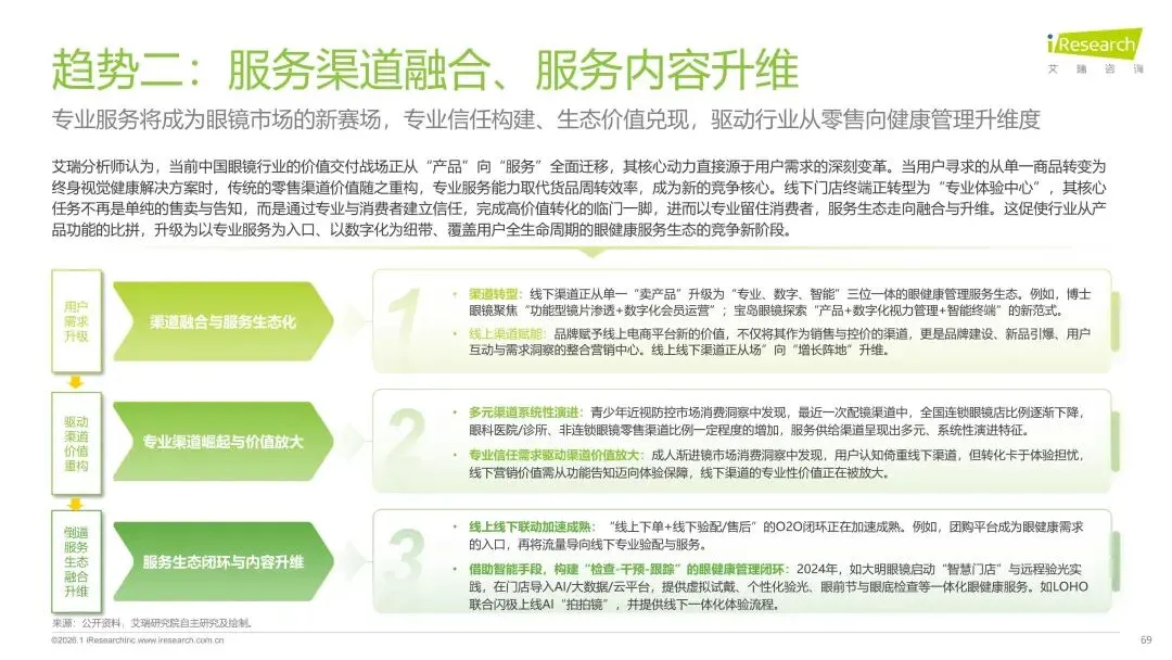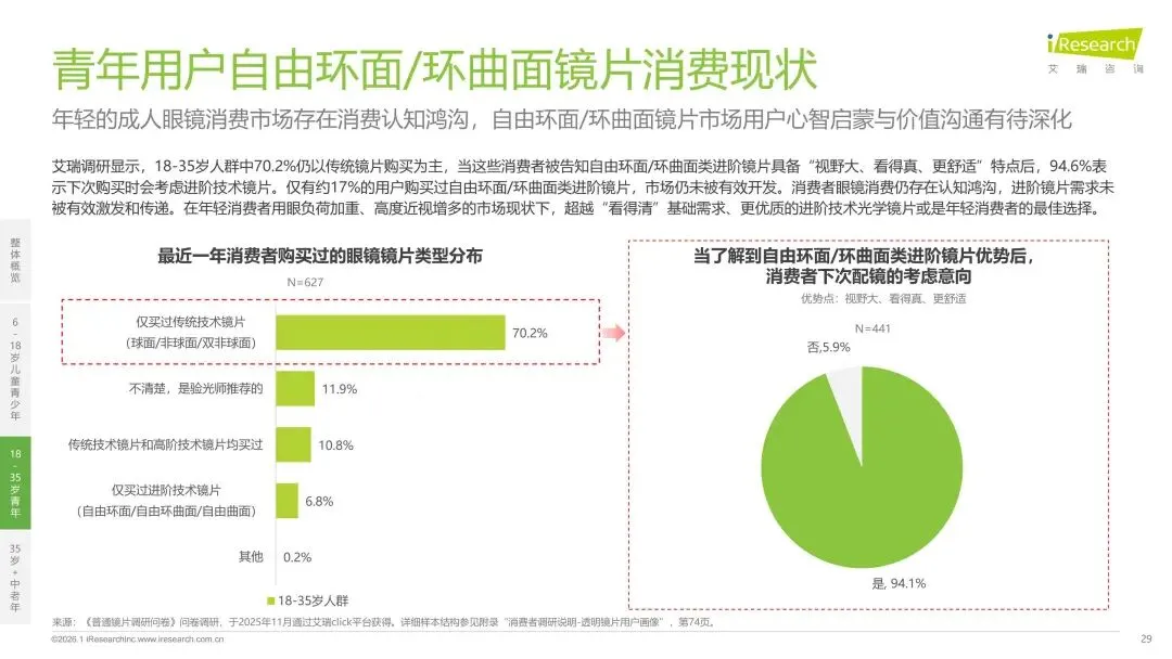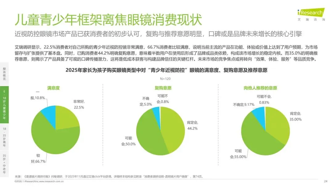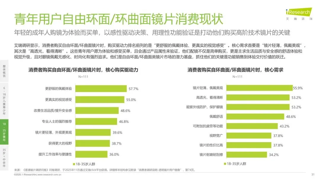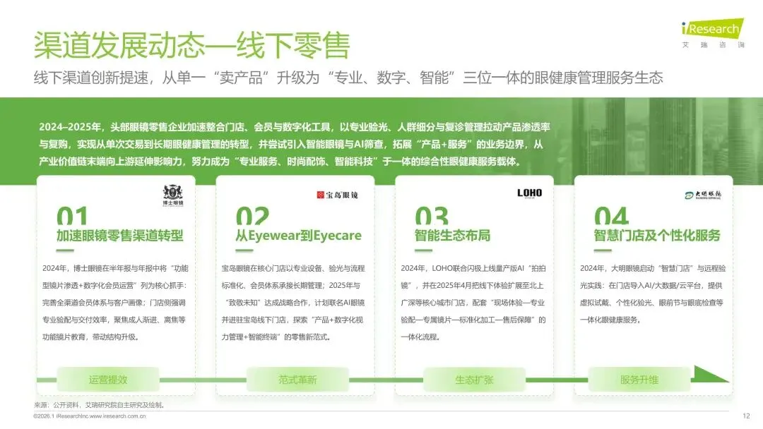 报告分别聚焦于透明镜片与变色镜片两大核心市场,详细梳理了针对儿童青少年、职场青年及中老年等不同人群的细分产品发展现状、技术演进路径、消费者需求洞察与市场趋势。最后,报告提炼出当前行业在价格、信任、服务等方面面临的共性痛点,并展望了未来在产品功能、专业服务、国牌崛起及产业融合等方面的重要发展趋势。本报告旨在为眼镜行业从业者、投资者及相关人士提供全面的市场洞察与决策参考。