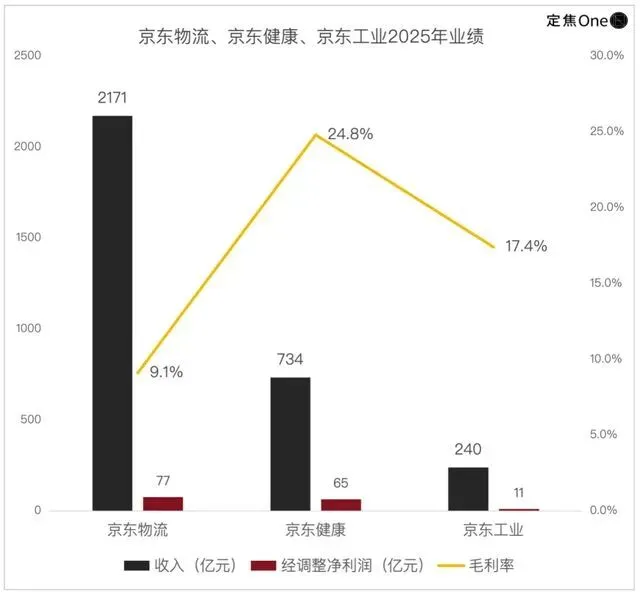 相比之下,京东健康成为"京东系"2025年最大的亮点。收入从582亿元增至734亿元,同比增长26.3%;经调整净利润高达65亿元,同比增长36.3%,利润率达8.9%,是最赚钱的子公司。