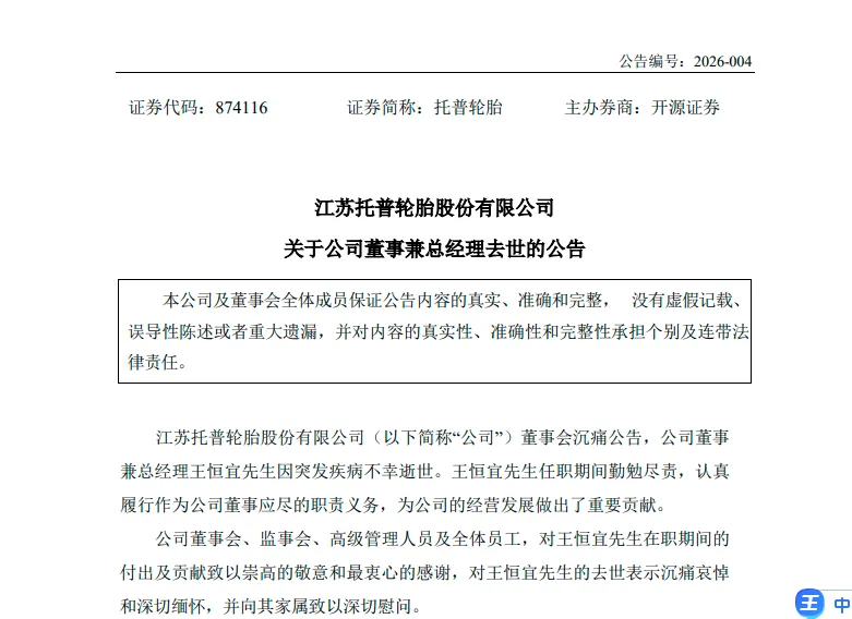 近日,江苏托普轮胎股份有限公司发布关于公司董事长兼总经理去世的消息。公告显示,公司董事兼总经理王恒宜先生因突发疾病,不幸逝世。