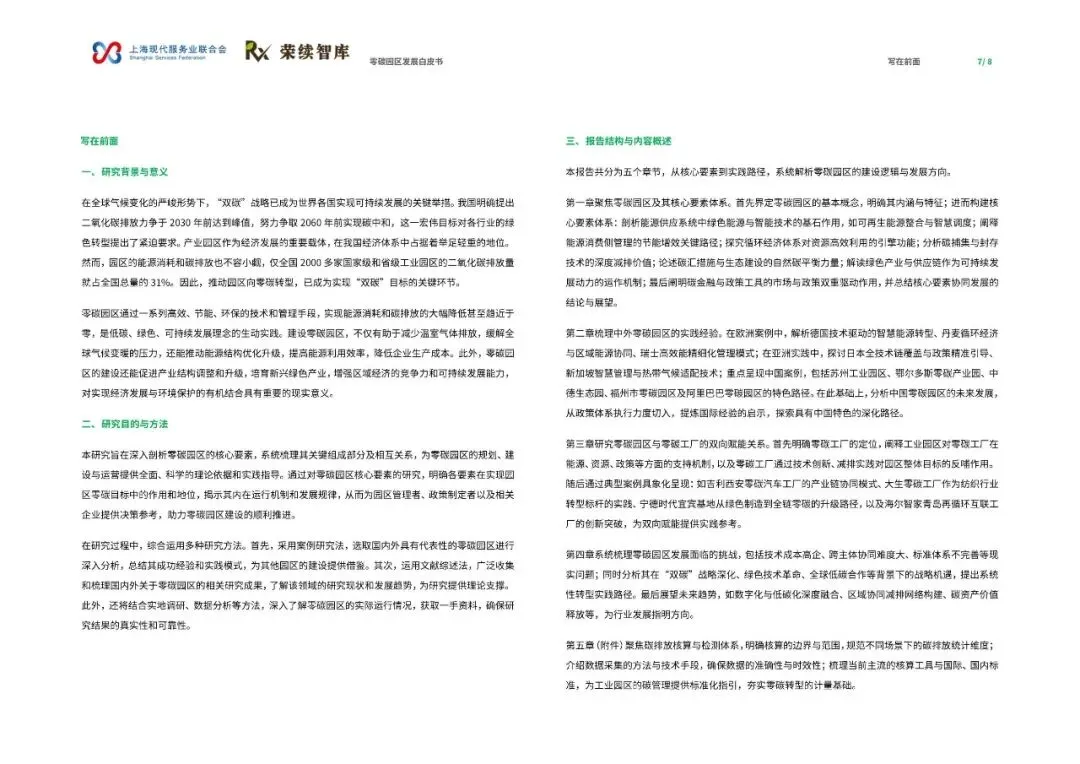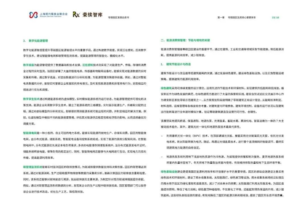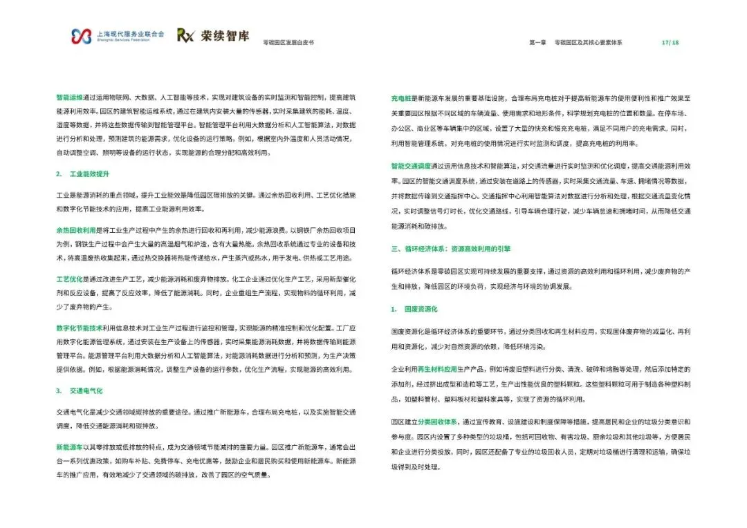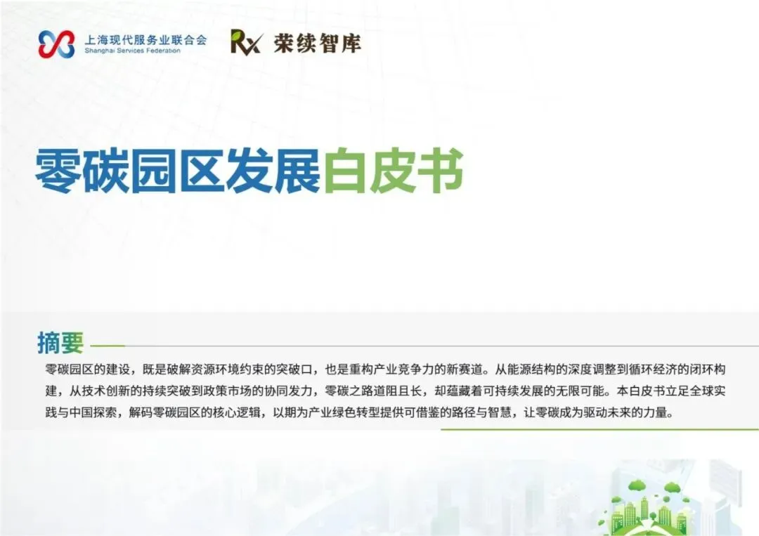 《零碳园区发展白皮书》由上海现代服务业联合会与荣续智库联合发布,旨在系统解析零碳园区的建设逻辑与发展方向,为产业绿色转型提供可借鉴的路径。报告指出,零碳园区建设是破解资源环境约束、重构产业竞争力的关键举措,也是实现‘双碳’目标的重要载体。