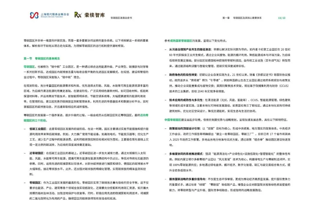 报告将零碳园区定义为一种通过综合运用能源升级、产业转型、碳捕获与封存等手段,实现园区内碳排放总量与吸收自我平衡的先进发展模式。其发展通常经历三个阶段:从主要通过节能提效降低排放的低碳园区,到大规模引入可再生能源并应用碳捕获技术的近零碳园区,最终迈向实现碳排放完全平衡的零碳园区。报告强调,这是一套多要素协同运转的复杂系统,而非单一的环保实践。