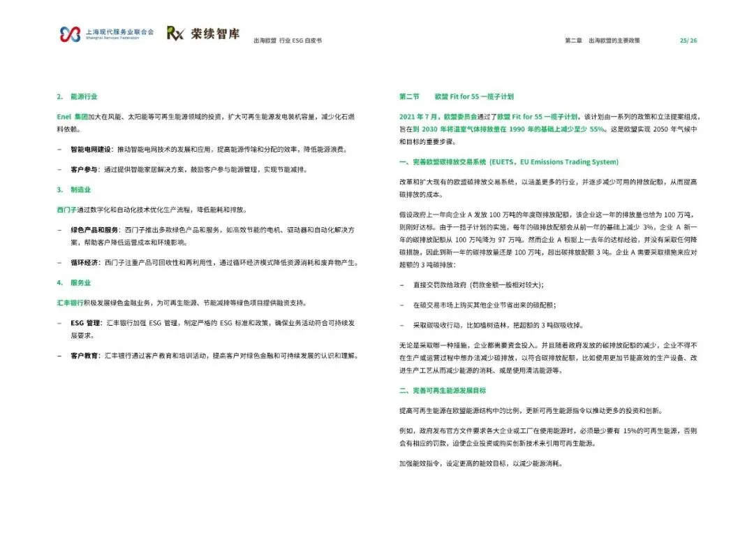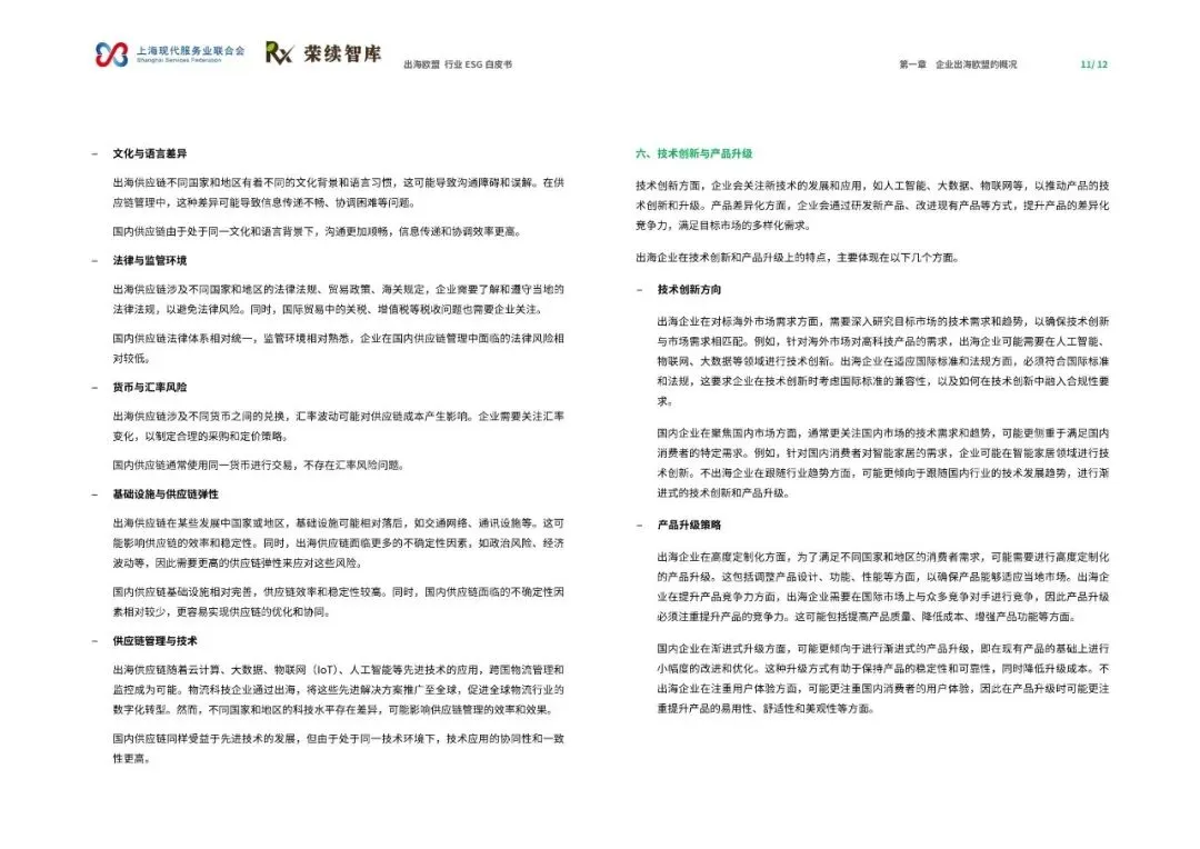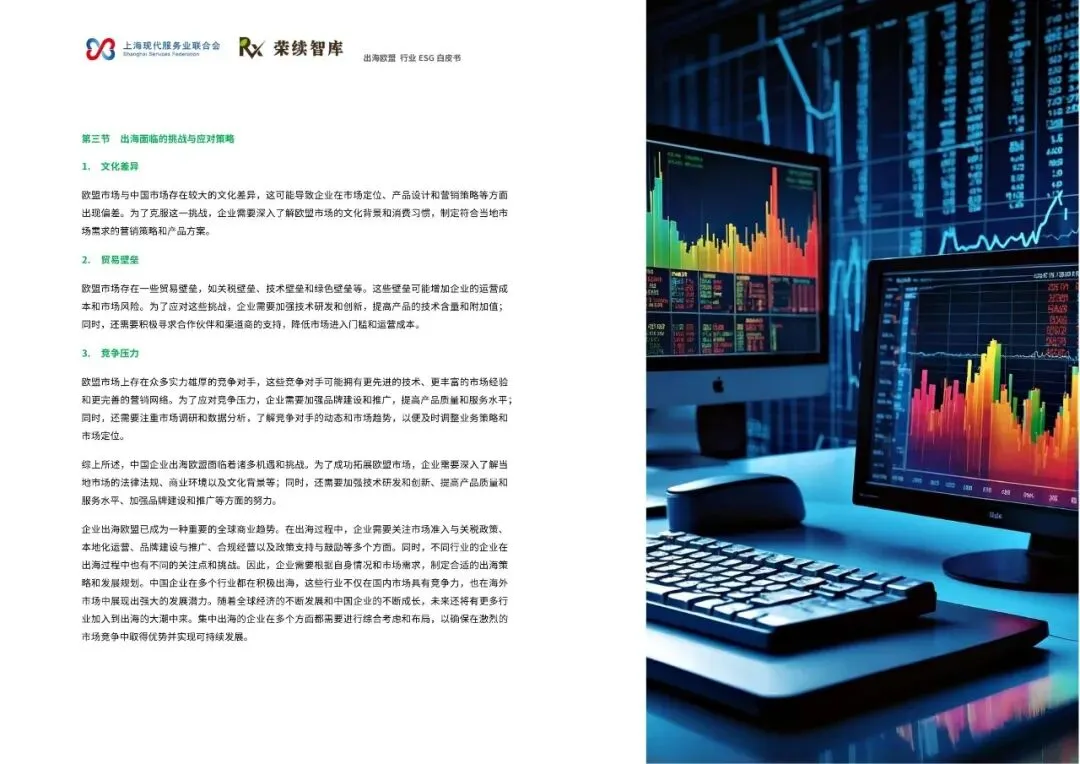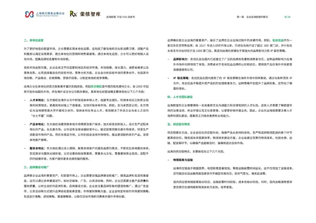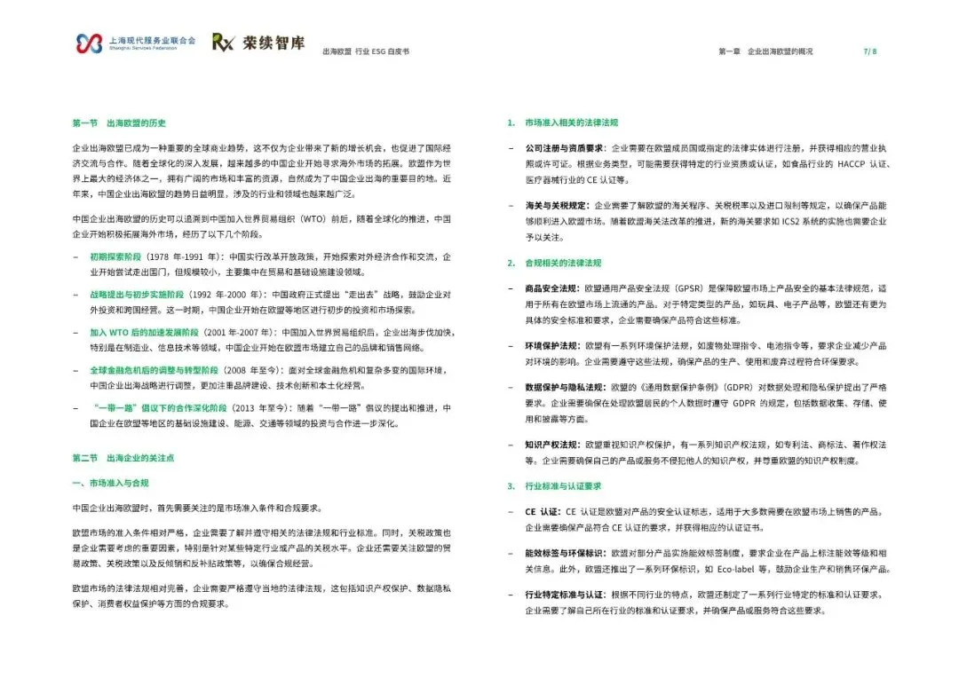 在全球可持续发展浪潮中,企业出海欧盟不仅是商业版图的拓展,更是一场与国际标准接轨的深度变革。由上海现代服务业联合会与荣续智库联合发布的《出海欧盟行业ESG白皮书》,深度剖析了欧盟严苛的ESG法规政策,挖掘行业绿色转型机遇,为出海企业提供从碳排放管控到社会责任践行,从供应链绿色重塑到企业治理革新的详尽策略与实操路径,助力企业在欧盟市场稳健前行。