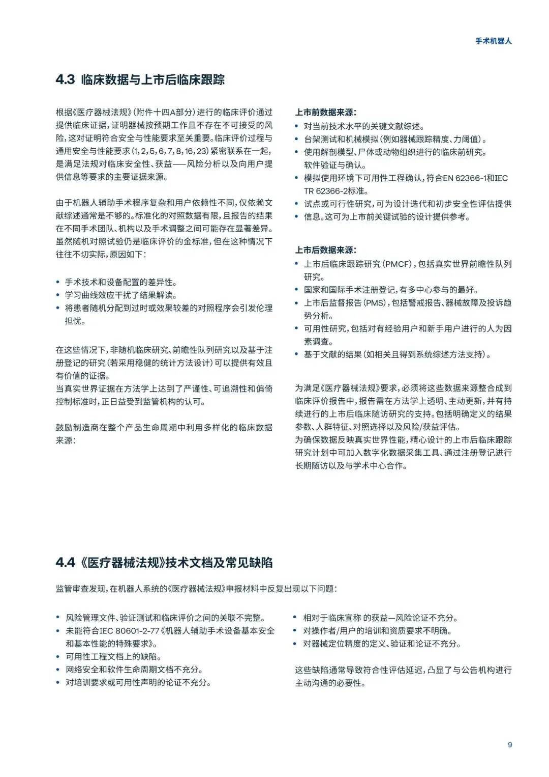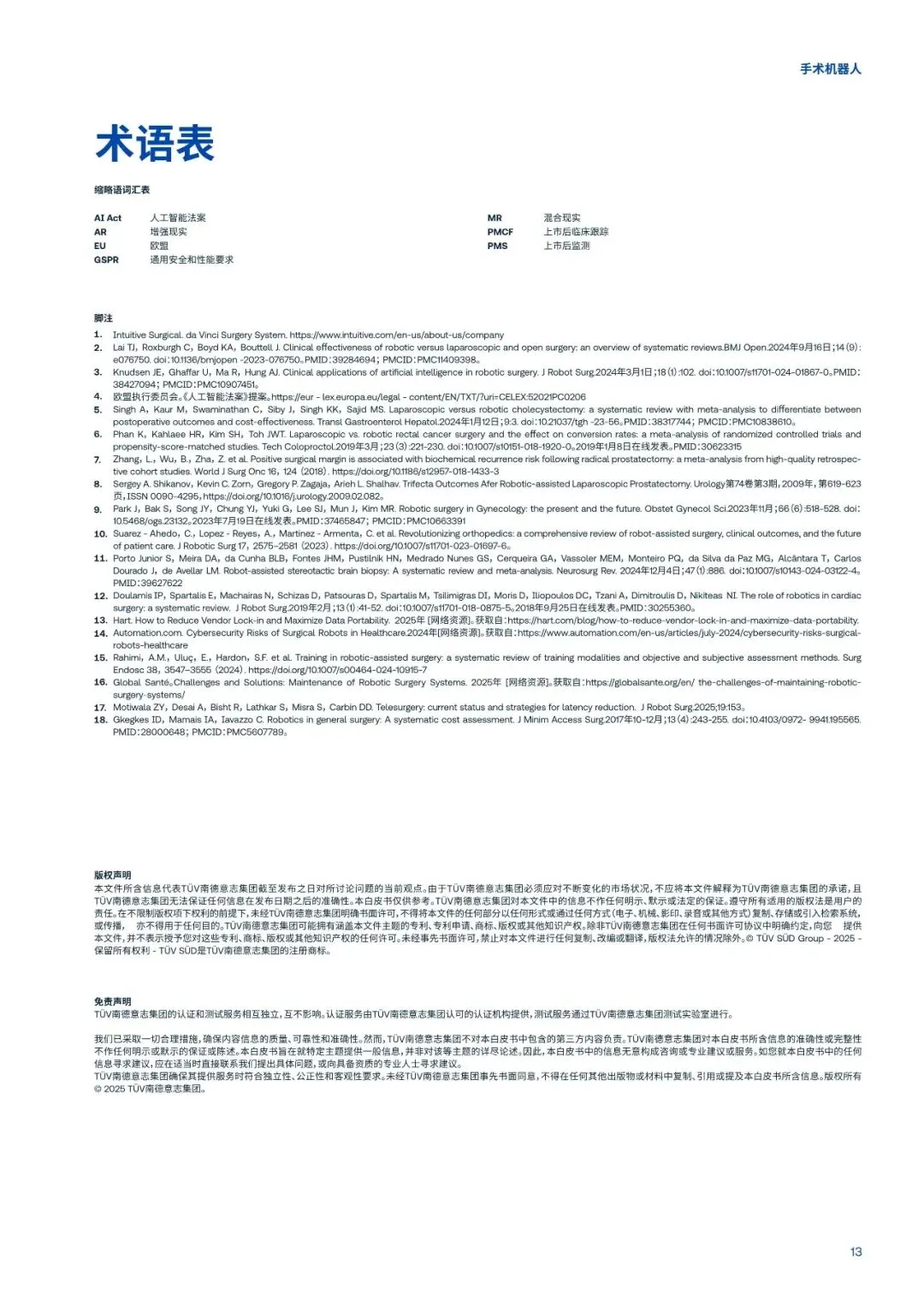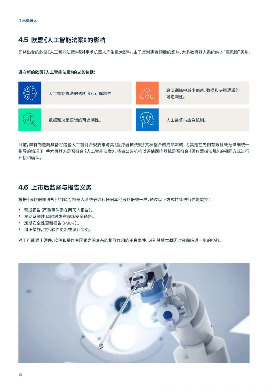 机器人系统受欧盟《医疗器械法规》的管辖。随着人工智能成为其核心功能组件,同时也受新颁布的《人工智能法案》的约束。制造商必须胜任应对机器人系统复杂的生命周期和监管环境,从设计与验证到市场准入,再到持续的性能监测。然而,现阶段机器人的全球性能标准化基准缺乏,加上各国监管解读差异,让全球市场准入的变得更加复杂。