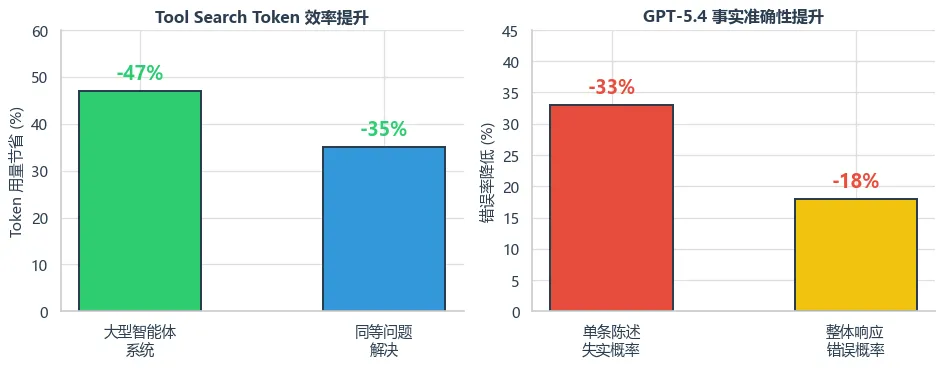 Tool Search 系统在大型智能体场景中可节省 47% 的 token 用量,这是显著的成本优化;而事实准确性方面,单条陈述失实概率降低 33% 更为关键,表明 GPT-5.4 在信息可靠性方面取得了实质性突破。