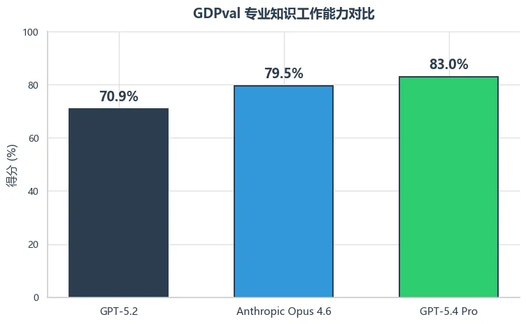 GPT-5.4 Pro 以 83.0% 的得分大幅领先竞品,展现出在专业工作任务中匹配或超越行业专家的卓越能力,这一突破意味着 AI 在专业服务领域的实用价值显著提升。