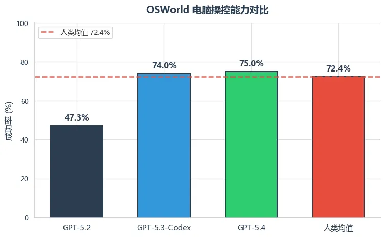关键数据: OSWorld-Verified 75.0% 超越人类均值 72.4%,较 GPT-5.2(47.3%)提升 +27.7pp。
