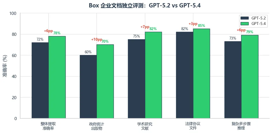 Box 对 GPT-5.4 进行了独立第三方评测(非 OpenAI 自测),结果如下:
