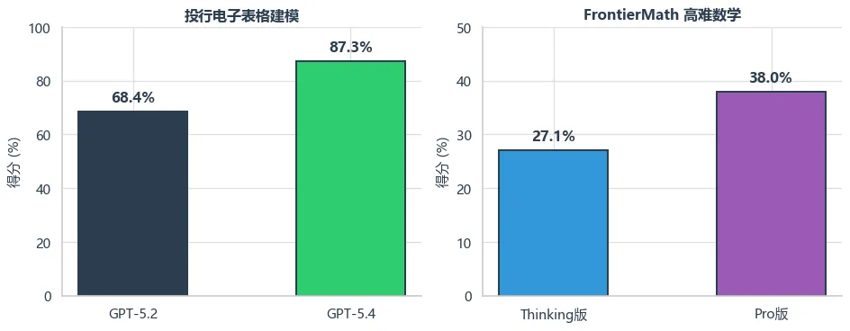 投行电子表格建模得分从 68.4% 提升至 87.3%,提升幅度高达 +18.9pp,这意味着 GPT-5.4 已经能够胜任初级投行分析师的核心工作;而 Pro 版在 FrontierMath 高难度数学题上的得分几乎是 Thinking 版的 1.4 倍,显示出企业级版本在复杂推理方面的显著优势。