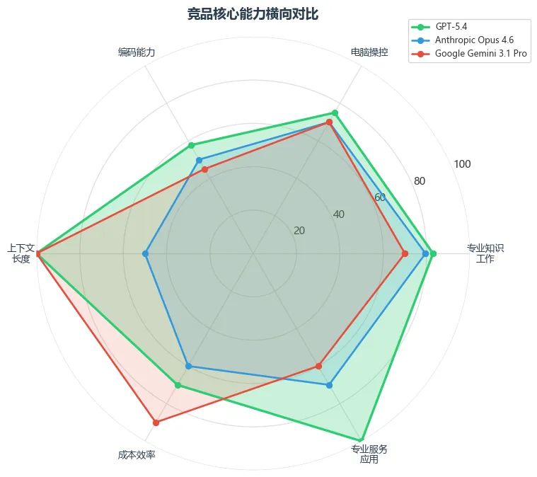 GPT-5.4 在专业知识工作、电脑操控和专业服务应用三个维度全面领先,Gemini 3.1 Pro 仅在上下文长度和成本效率方面保持优势,这反映出各厂商不同的技术路线和市场定位。