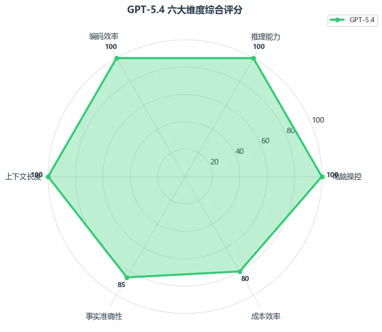 五大核心能力均获得满分,事实准确性和成本效率略低但仍保持优秀水平,这种全面均衡的能力分布正是 GPT-5.4 作为”一体化智能体”的核心竞争力所在。