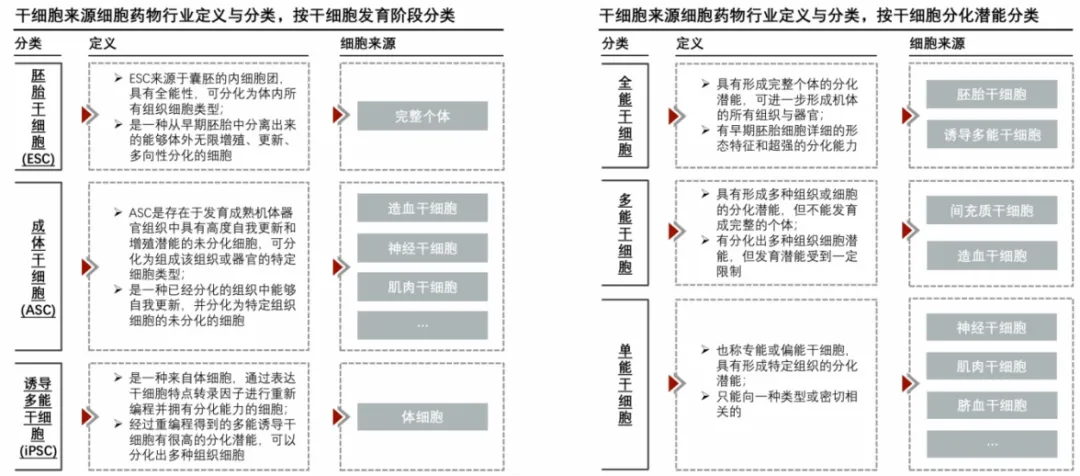 (图干细胞的分类:按来源分类(左图)以及按分化潜力分类(右图))