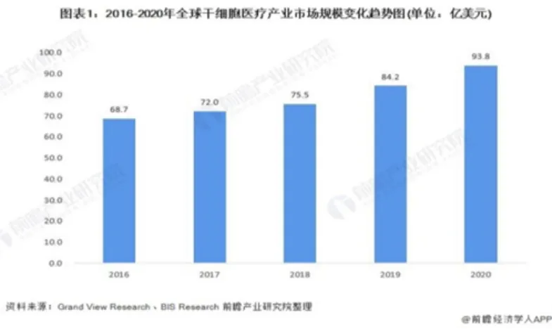 根据国际研究机构Grand View Research的研究数据显示,全球细胞市场规模从2016年的68.7亿美元增长到2020年的93.8亿美元: