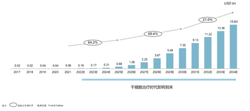 根据沙利文预测,自2024年起,干细胞医疗市场将迈入蓬勃发展阶段,年均复合增长率将超过80%,到2034年占据整个医疗市场产业规模的30%: