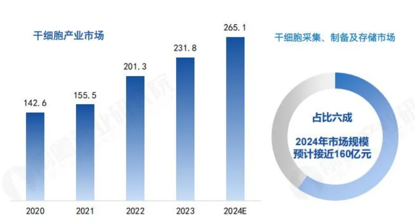 干细胞医疗产业链的发展涉及干细胞存储、干细胞药物开发、干细胞治疗,未来三个方向的发展空间均巨大。根据QYResearch的研究数据,2020-2026年,中国干细胞医疗产业市场规模复合增长率约为15%,未来几年,中国干细胞医疗产业市场规模在全球市场规模中的占比将进一步上涨。前瞻保守估计,到2026年,中国干细胞医疗产业市场规模将达到325亿元。干细胞的采集制备储存市场规模近160亿元: