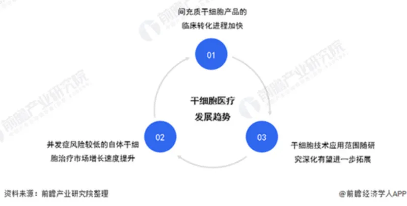 根据现行趋势,中国干细胞产业的发展将表现在3个方面:(1)当前有大量的间充质干细胞临床试验在全球范围内展开,随着研究进程的加快,将推动间充质干细胞产品的临床转化进程;(2)自体干细胞由于具有并发症风险低的特征,自体干细胞治疗市场、自体干细胞储存市场也有望加速增长;(3)随着干细胞在临床转化方面的发展,干细胞技术的应用范围也将随着研究的深化而得到拓展。