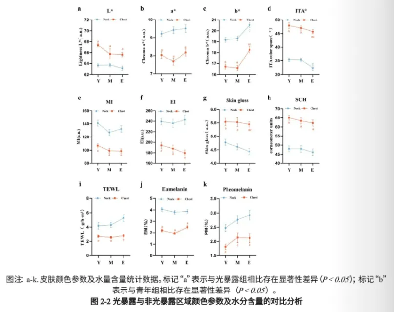 这个章节,半亩花田首先梳理了光暴露对中国女性肤色变化的影响,通过对180名志愿者(覆盖青年组、中年组和老年组),以及光暴露与非光暴露组的皮肤进行全面分析对比,发现光暴露皮肤的MI值(黑色素指数)和EI值(红斑指数)会显著高于非光暴露皮肤组,从而直接证明了光暴露组皮肤会更为暗沉、泛红且显著泛黄。