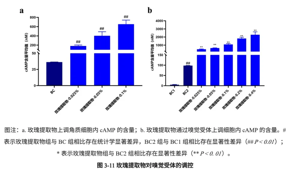 因此,通过研究发现,玫瑰提取物在0.025%、0.05%和0.1%浓度下,可以显著激活角质形成细胞中的cAMP的表达,且呈现浓度依赖性,而cAMP是和嗅觉受体相关的靶点,表明玫瑰提取物可以以嗅觉受体的方式来调节黑色素合成,从而让皮肤变白。