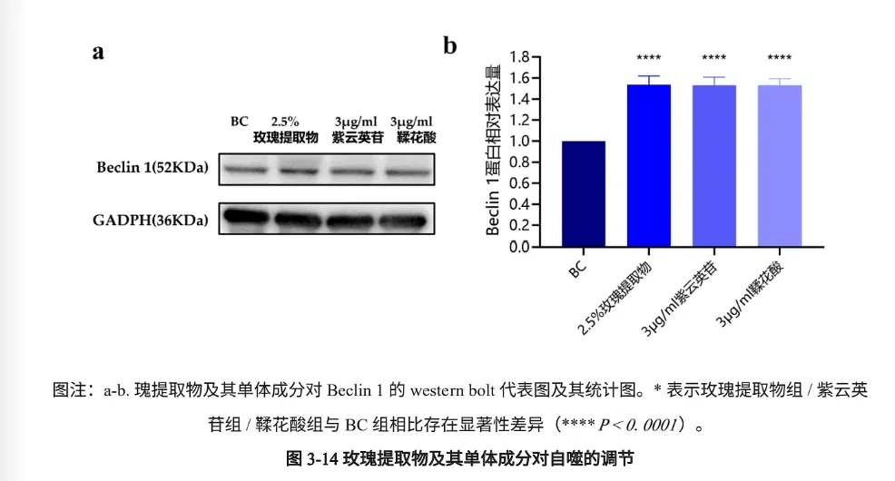 同时,半亩花田还发现,玫瑰提取物可以通过上调溶酶体蛋白酶的表达,增强细胞对黑素小体的降解能力,而除了玫瑰提取物本身,玫瑰提取物的主要美白活性物紫云英苷和鞣花酸对B16细胞中的自噬相关蛋白Becclin-1都具有显著的上调作用