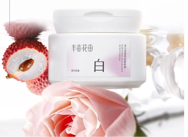 最后一个产品是半亩花田美白净滑香氛磨砂膏,小K觉得这个品是创新性很足的一款磨砂膏;因为常规磨砂膏往往只是通过添加磨砂来暴力去除老废角质,这容易破坏皮肤屏障功能;亦或者加一点点概念性的美白成分,去“擦边”用后能让皮肤美白。