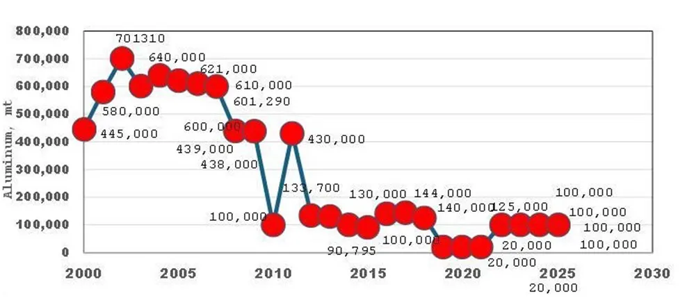 ▲从2008年到2025年,委内瑞拉的原铝产量大幅下降
