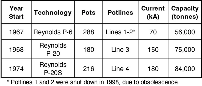 在完成一期电解槽的建造和启动后,冶炼厂的设计产能增加到10000吨原铝。随后,又建造并启动了三条额外的生产线,使其额定产能达到每年12万吨。多年来,冶炼厂的用电量因运营能力而异,潜在的最大电力需求超过400兆瓦。