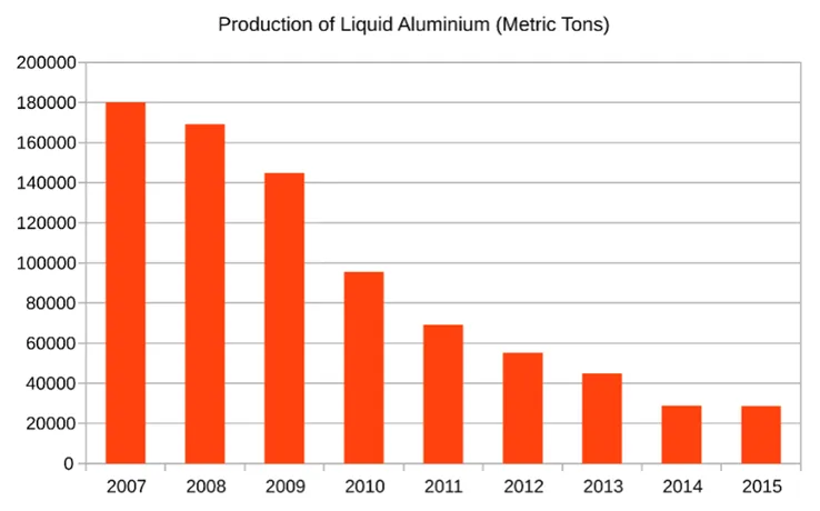 ▲2007年至2015年,阿尔卡萨冶炼厂的铝产量大幅下降