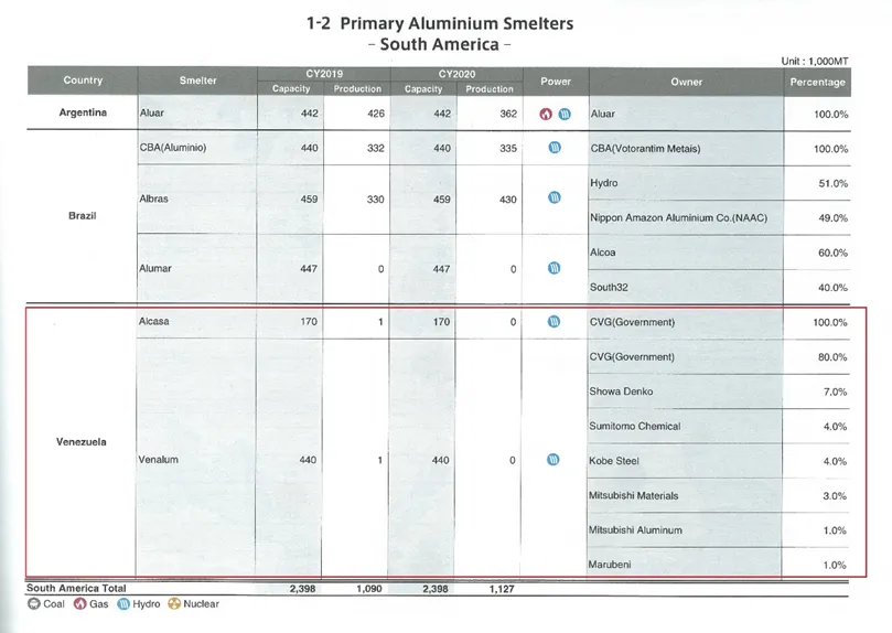▲委内瑞拉国内两大主要原铝冶炼厂产能情况(2019-2020年)