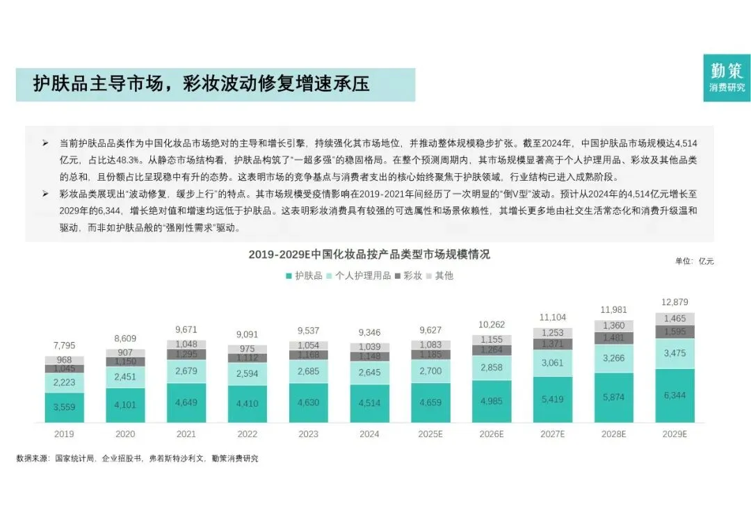 2024年行业规模4,664亿元,同比微降但韧性仍存;2024-2029年复合增长率6.6%,高于全球均值两倍。护肤品占48.3%(4,514亿元),彩妆修复性增长却仅由2019峰值1,482亿元回升至2024年1,306亿元,弹性有限。人均消费664元,对标日韩6倍空间,下沉市场与功效升级将成增量双轮。