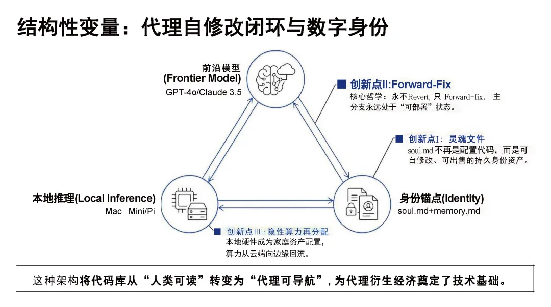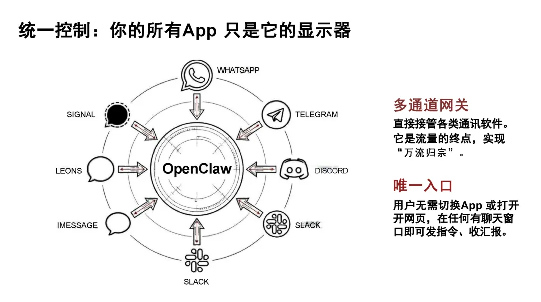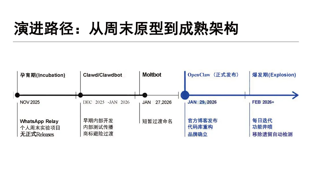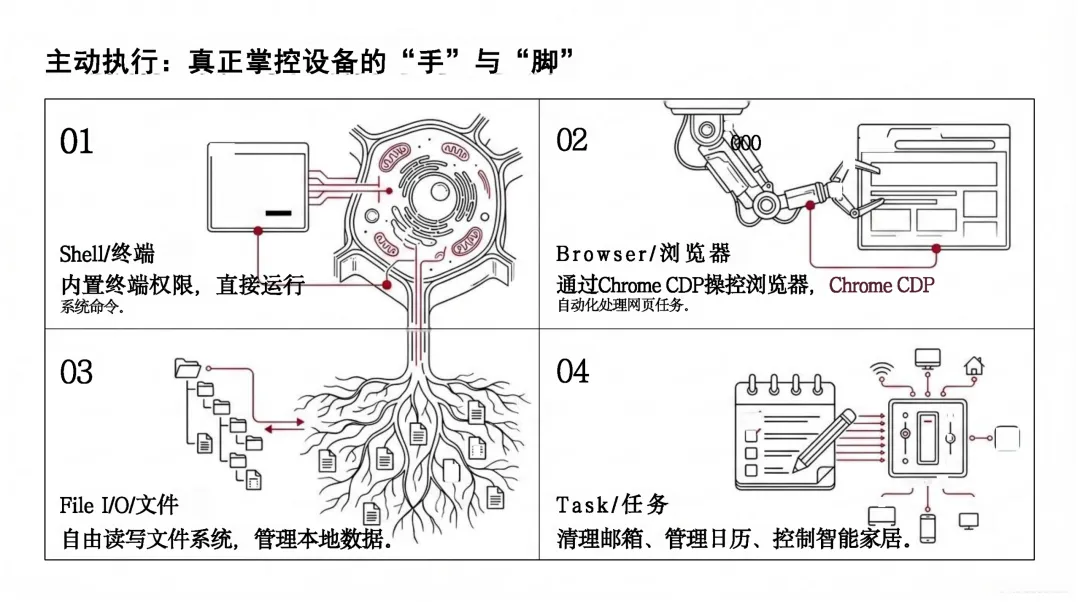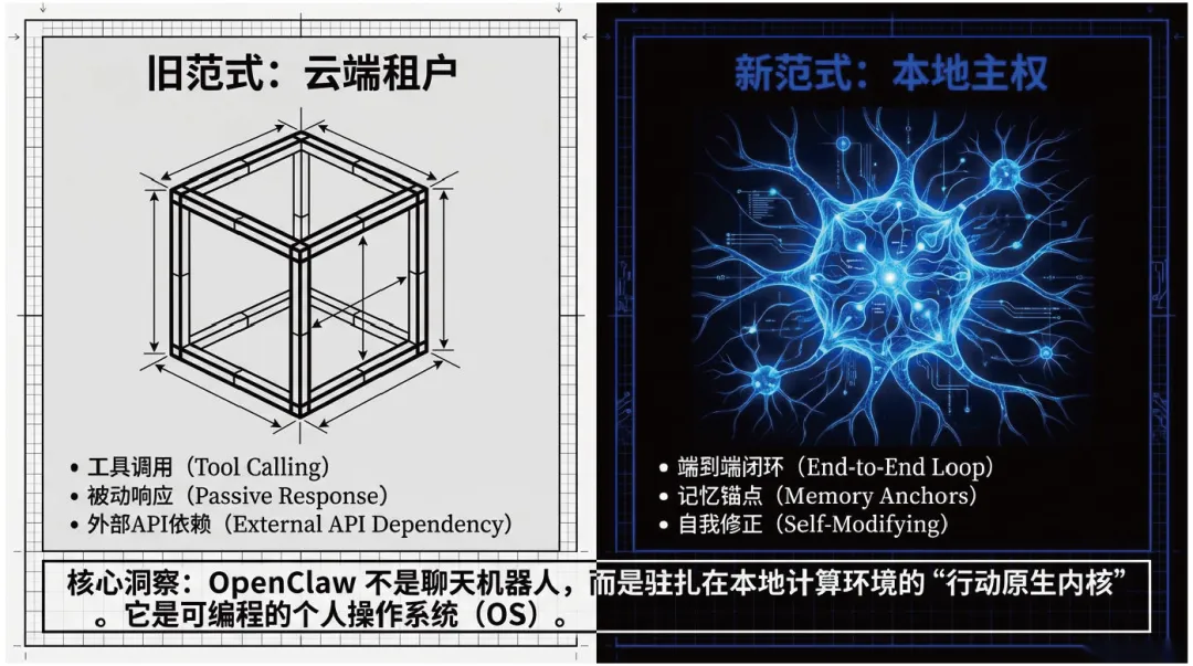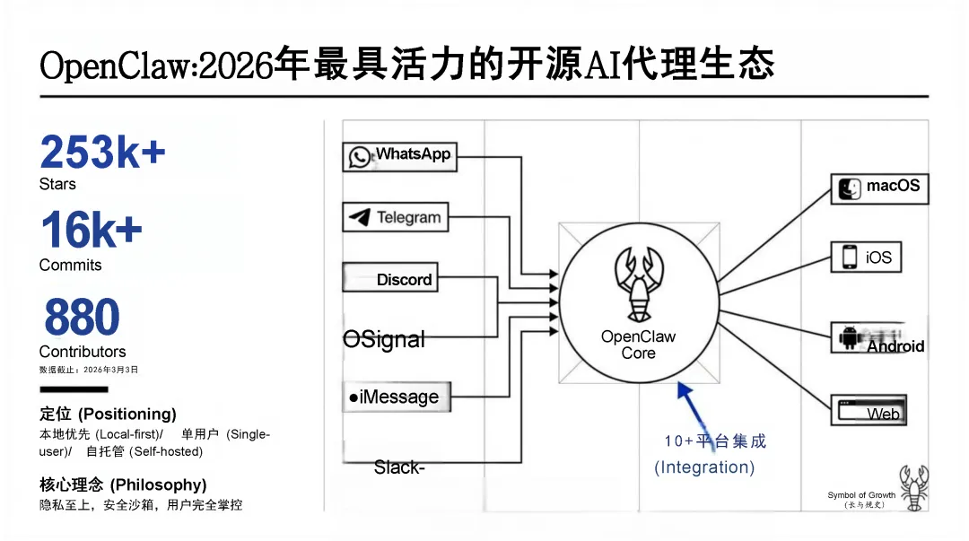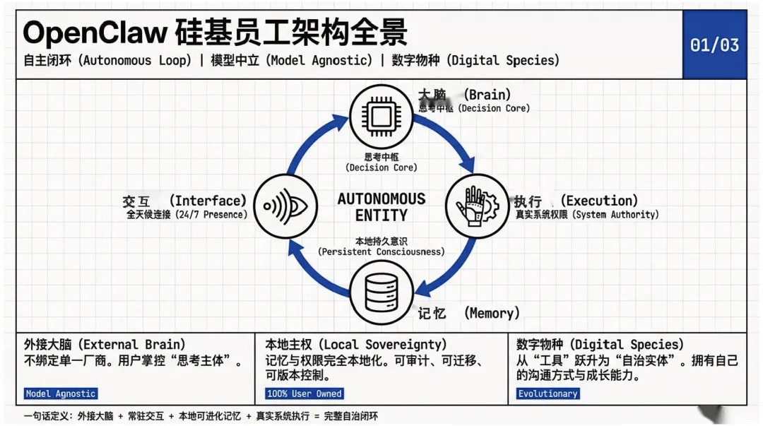 核心理念,历经从周末原型到成熟架构的演进,实现多模态、跨 10 + 平台集成的技术能力,构建了 “外接大脑 + 常驻交互 + 本地可进化记忆 + 真实系统执行” 的自治闭环架构,从 “消息中继” 升级为 “数字孪生”;