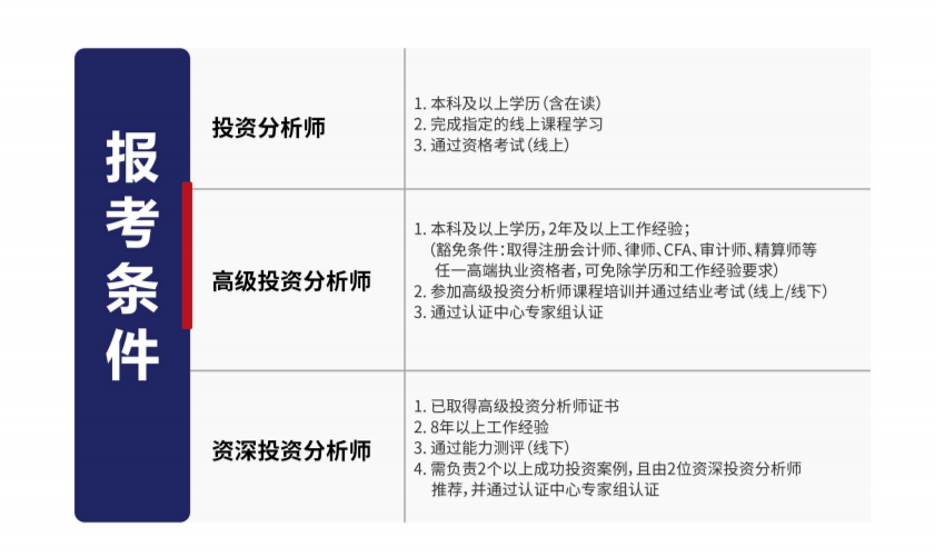 申请人须践行风投创投行业职业操守并具有相关专业能力及知识体系,通过统一培训、考试、推荐及相关资格审核后取得相应等级的投资分析师认证资格。