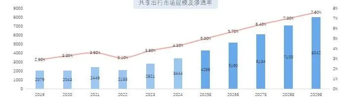 我国作为全球第二大人口国和第二大经济体,拥有全球最大的出行市场,在互联网、电车等配套行业的不断发展推动下,2024年共享出行市场规模已达3,444亿元,渗透率约4.3%。且随着居民共享出行需求的增加及下沉市场普及度的增加,预计2025-2029年的CAGR可达17%,增速远高于私家车、出租车、公共交通等出行方式。