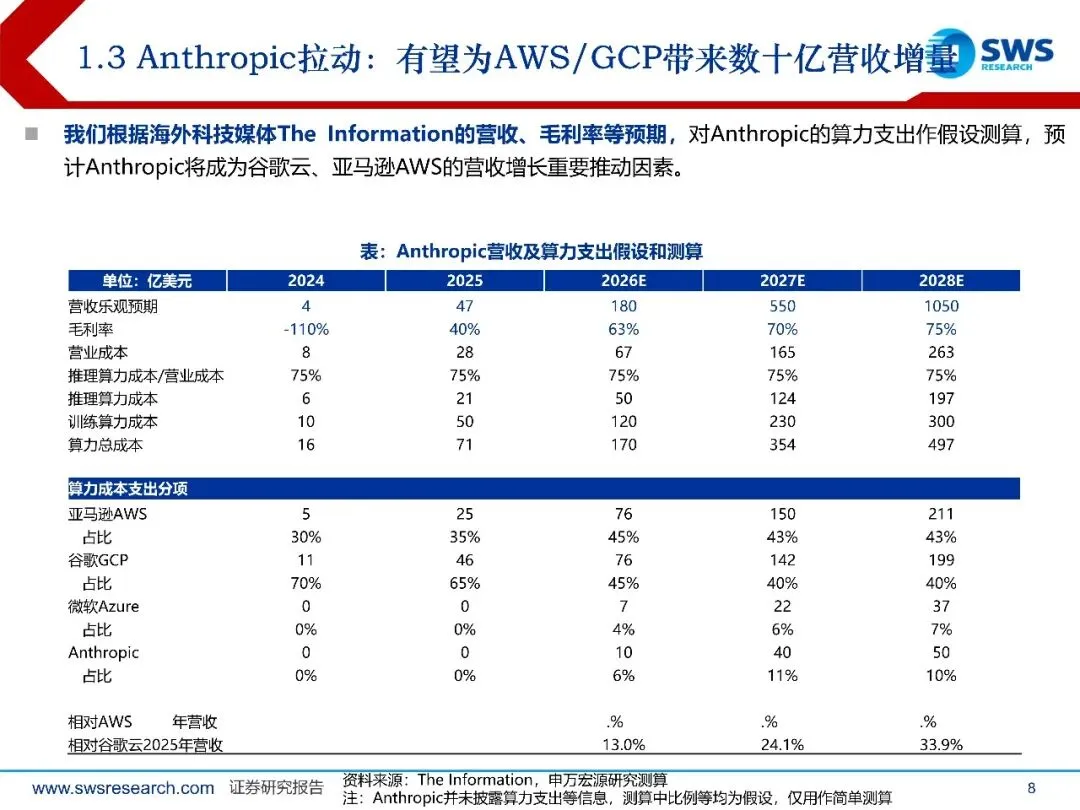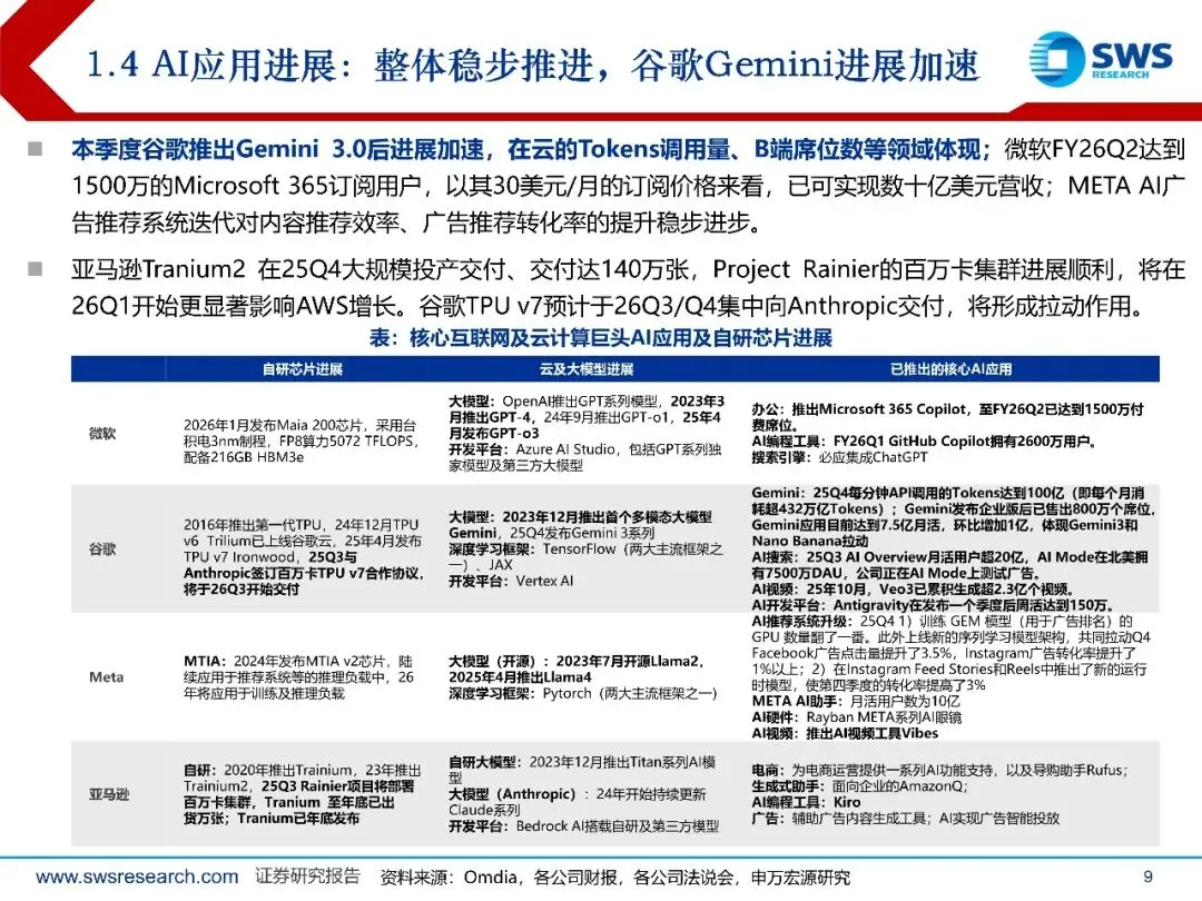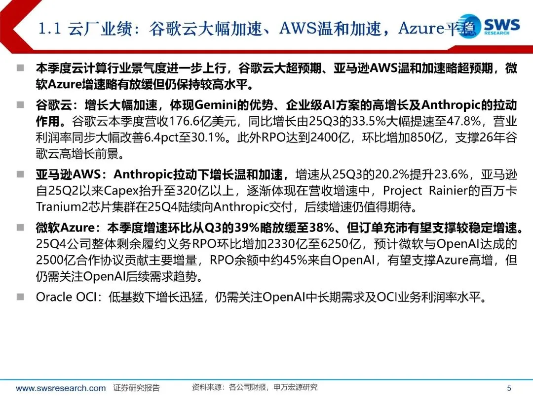 云计算:行业景气度持续上行,增长趋势分化。本季度,Anthropic和名谷歌Gemini在大模型领域表现出色,推出具有竞争力的模型及在应用领域大步迈进,谷歌云大超预期,营营收同比增速由33.5%大幅提速至47.8%、且营业利润率达到30.1%,体现Gemini的优势、企业级AI方案的高曾长及Anthropic的拉动作用;亚马逊AWS在Anthropic拉动下温和加速,营收增速升至23.6%;微软Azure增长长则略有放缓至38%,表现相对平