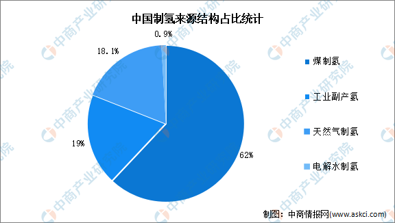中国是世界最大的制氢国家,能源结构为“富煤少气”,煤制氢成本要低于天然气制氢,62%的制氢量来自于煤或焦炭生产,工业副产氢占比约为19%,天然气制氢占比18.1%,电解水制氢占比不足1%。