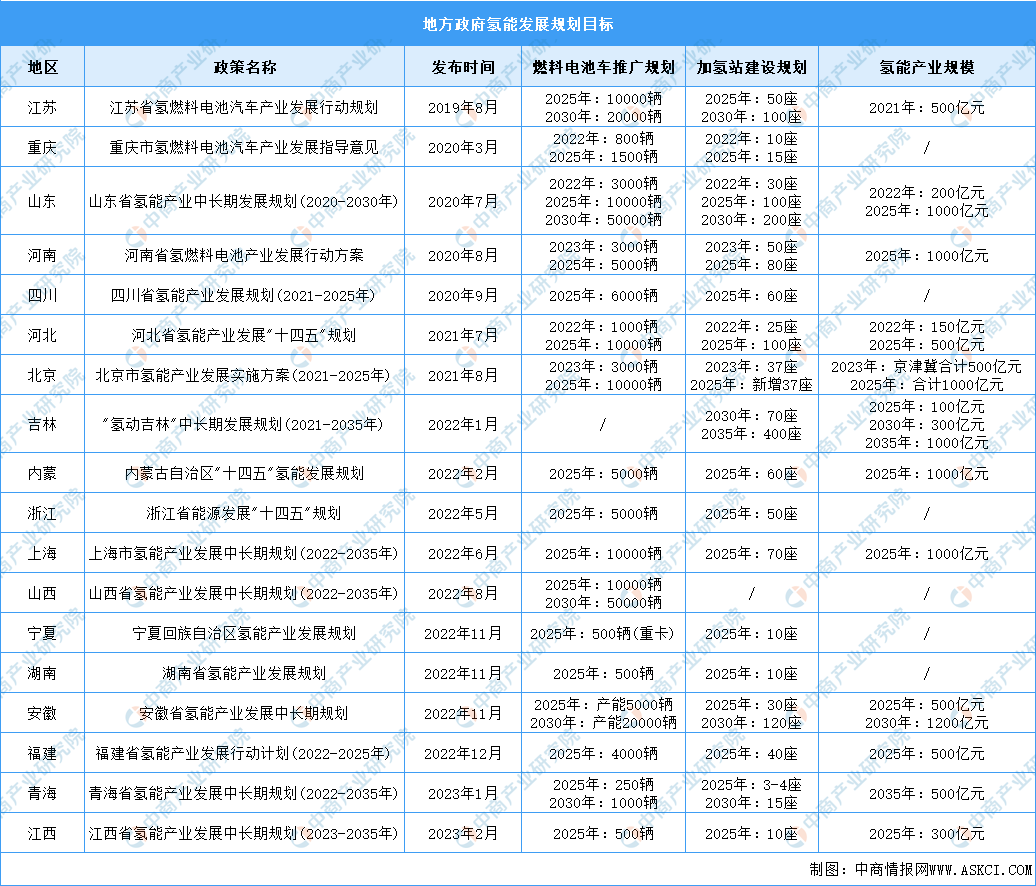 各地方政府纷纷出台氢能发展规划目标。2019年以来,国内至少有18个省级行政区公布了氢能发展规划目标。从已公布的规划目标来看,到2025年,我国将累计至少建成加氢站762座,燃料电池车保有量8.8万辆,氢能产业规模接近7000亿元。