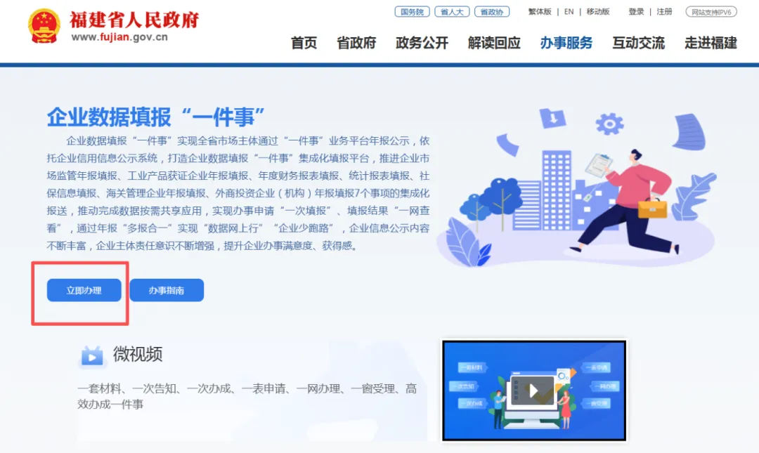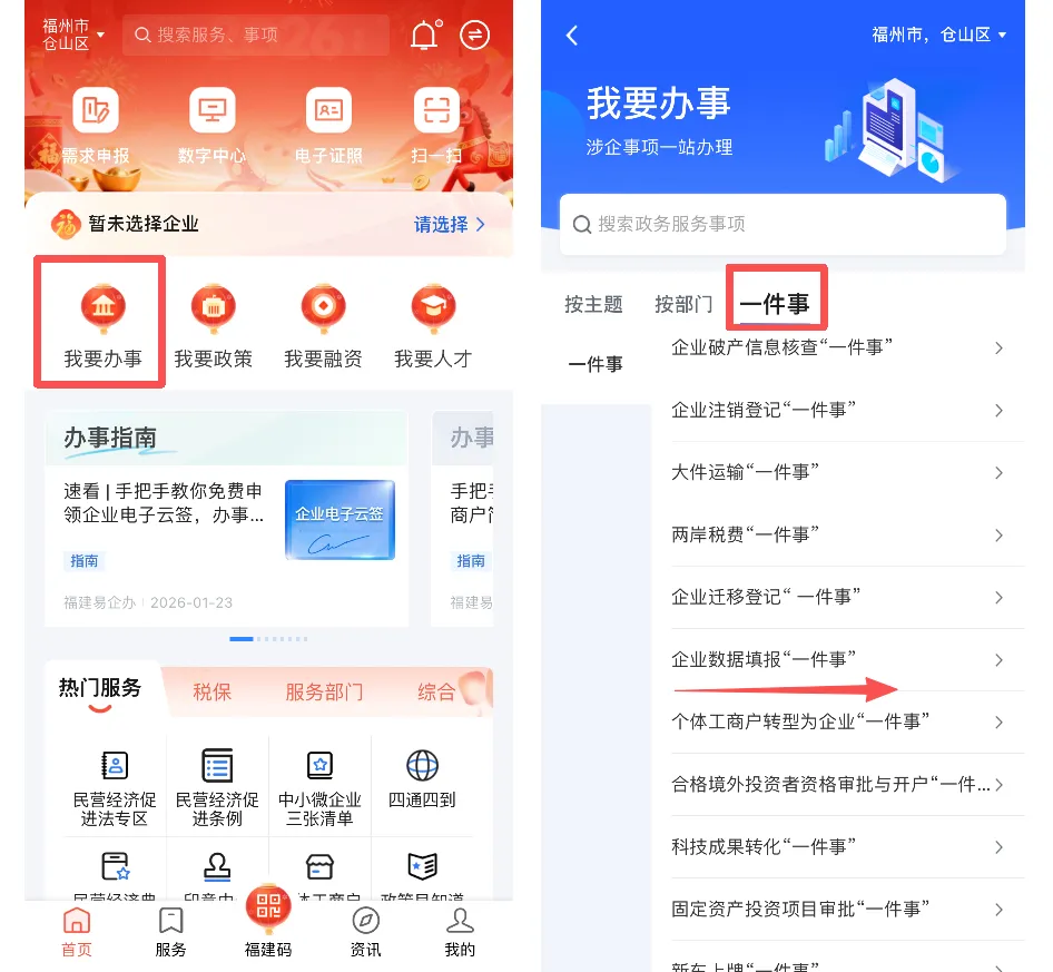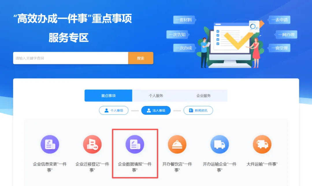 方法二:登录福建省网上办事大厅(https://zwfw.fujian.gov.cn/)找到高效办成一件事专区,在服务专区的法人服务,找到企业数据填报一件事。