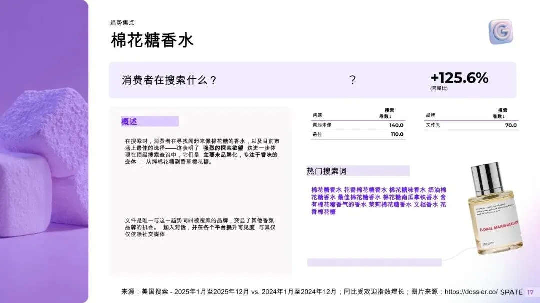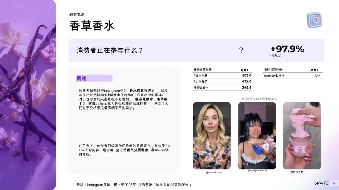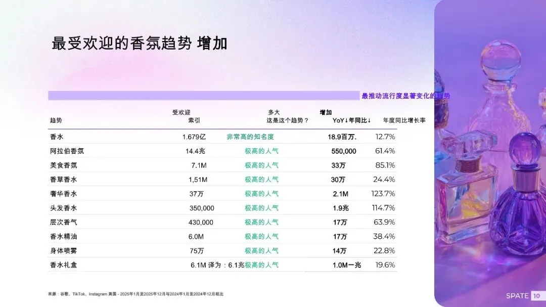 TikTok:主导香氛探索与实验,创作者测评、香氛分层(layering)内容病毒式传播,推动小众品牌出圈。 Google:捕捉高意图购买行为,如“新娘香水推荐”“办公室香薰持久款”等场景化搜索量同比增长超60%。 Instagram:强化美学认同与品牌调性,成为高端香氛与生活方式品牌的核心阵地。 场景化香氛需求爆发消费者对“特定情境用香”的认知显著提升: