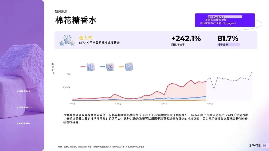 新娘香水:依托谷歌搜索崛起,Jo Malone London为当前唯一头部品牌,市场空白明显。 职场提神香:柑橘调、绿叶调香氛在办公场景中使用率上升,部分品牌推出“专注香薰”系列。 居家疗愈香:木质调、焚香调香薰在卧室、书房高频使用,满足情绪舒缓需求。 美食香氛成最大增长极2026年,开心果、焦糖、蜂蜜、抹茶、椰子等美食系香调年同比增长率均超700%,大溪地香草、柳叶马鞭草等小众香调增长率甚至超2000%。