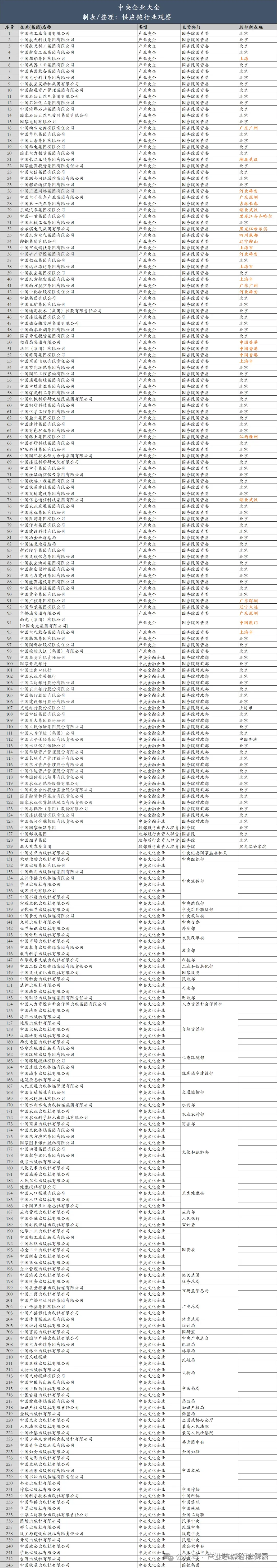 前1~10为涉军工央企,分别为:中国核工业集团、中国航天科技集团、中国航天科工集团、中国航空工业集团、中国船舶集团、中国兵器工业集团、中国兵器装备集团、中国电子科技集团、中国航空发动机集团、中国融通资产管理集团。第11~22为能源类央企,其中11~14为石油类央企,分别为中石油、中石化、中海油及国家石油天然气管网集团;15~22为两大电网(南方电网、国家电网)及六大发电集团(华能、大唐、华电、国电投、三峡和国家能源集团);23~27为通信及电子信息央企,分别为:中国电信、中国联通、中国移动、中国卫星网络集团、中国电子信息产业集团;28~33为装备制造类央企,分别为:中国一汽、东风汽车、中国一重集团、中国机械工业集团、哈尔滨电气集团、中国东方电气集团;34~37为矿产资产类央企,分别为:鞍钢、中国宝武、中国矿产资源集团、中国铝业集团;38~41为交通运输行业央企,中国远洋海运集团、中国航空集团、中国东方航空和中国南方航空集团。42~43为涉农类央企,包括中国中化和中粮。此外,包括中国五矿集团、通用技术集团、中建集团、中国储备粮集团、中国南水北调集团、国投集团、招商局集团、华润集团、中国旅游集团、中国商飞集团分属不同行业。