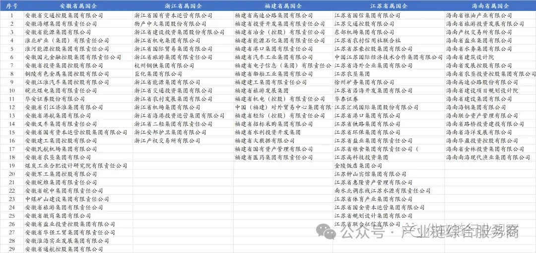东南一徽包浙江、福建、江苏、海南、安徽等5省,共107家省属国企,其中安徽省29家、江苏省26家、浙江16家、福建18家、海南18家。