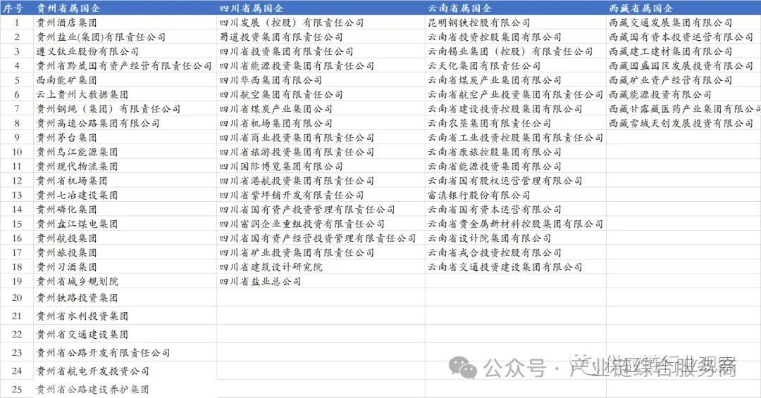 西南四省包括四川、云南、贵州和西藏,共70家省属国企,其中四川省19家、贵州省25家、云南18家、西藏8家。