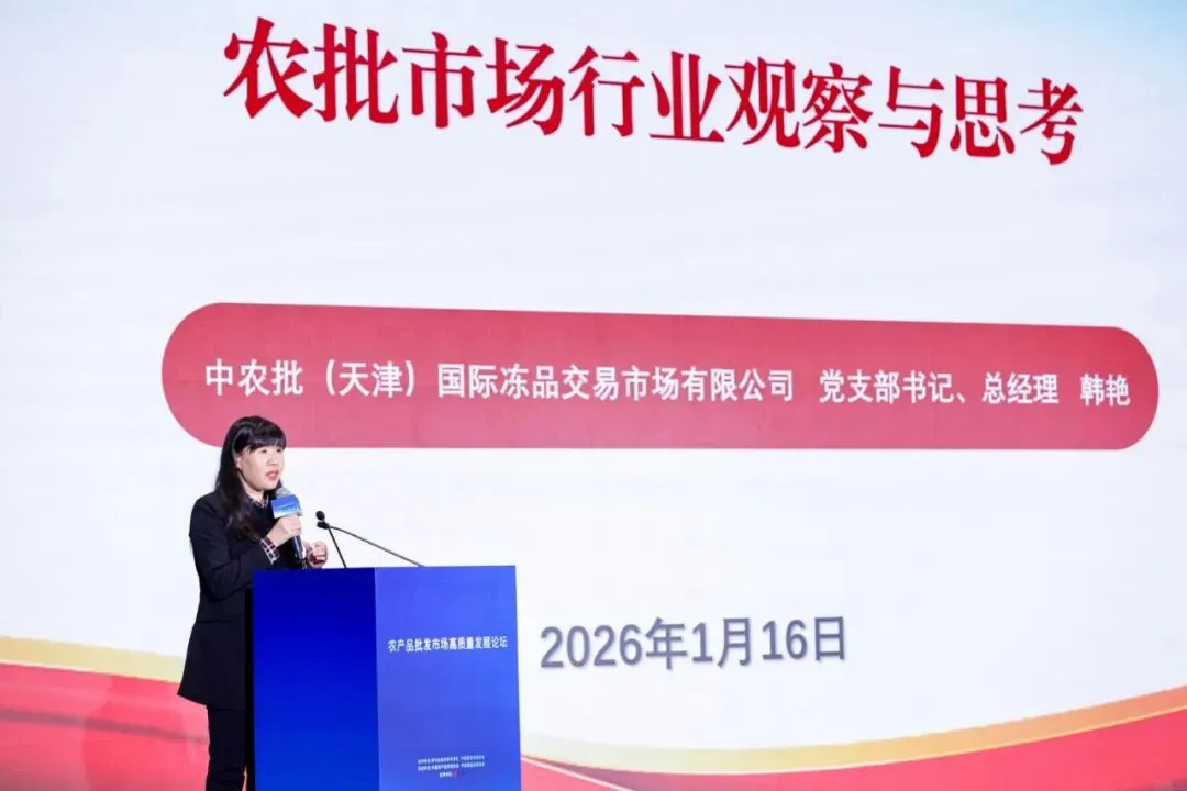2026 年 1 月 16 日下午,互通共赢·精耕运营-农产品批发市场运营实战论坛在北京新华社国家金融信息大厦顺利举办。中农批(天津)国际冻品交易市场有限公司党支部书记、总经理韩艳,以深耕行业全局研究、兼具政策解读与实战操盘经验的专业视角,带来 “农批市场行业观察与思考” 主题分享,为行业破解发展难题、把握转型机遇提供权威指引。