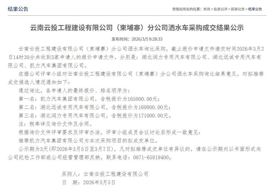 3月5日,云南云投工程建设有限公司(柬埔寨)分公司洒水车采购成交结果公示,凯力汽车集团有限公司以16.5万元报价成功中标,成为拟成交单位。