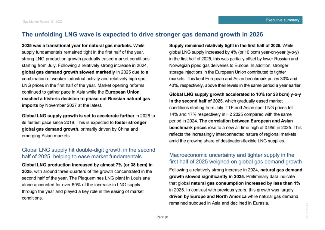 报告的主线是:2025年是市场从紧张走向宽松的“过渡年”,增长主要来自LNG供应端的恢复;而2026年预计将成为新增长周期的起点,强劲的LNG供应浪潮将同时拉动需求和贸易,推动市场进入一个供应更充裕、但地缘与气候风险依存的新阶段。