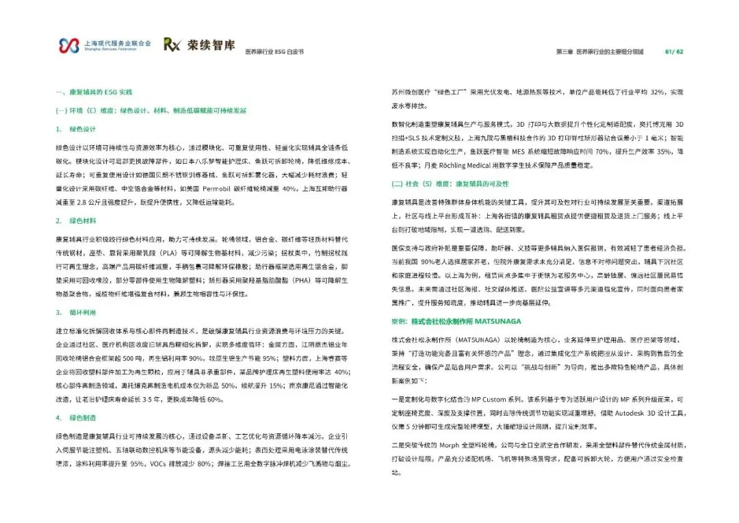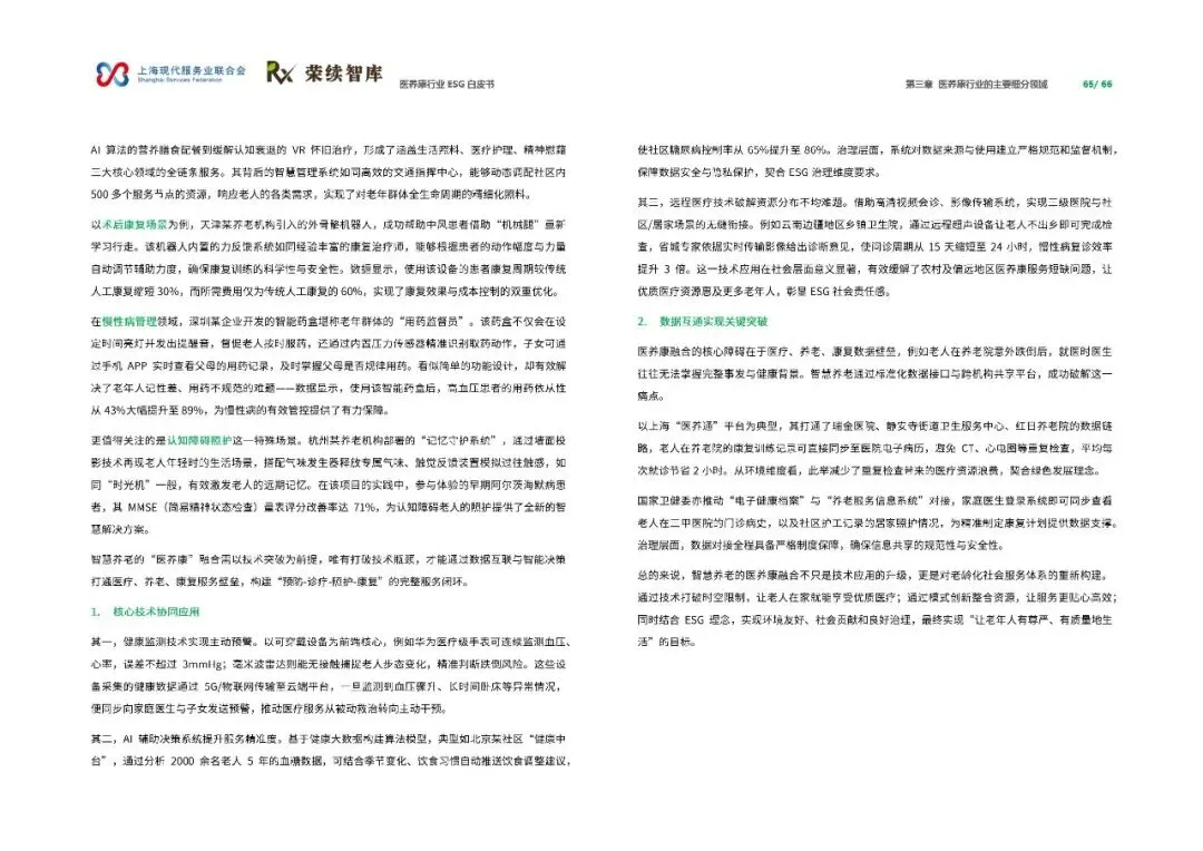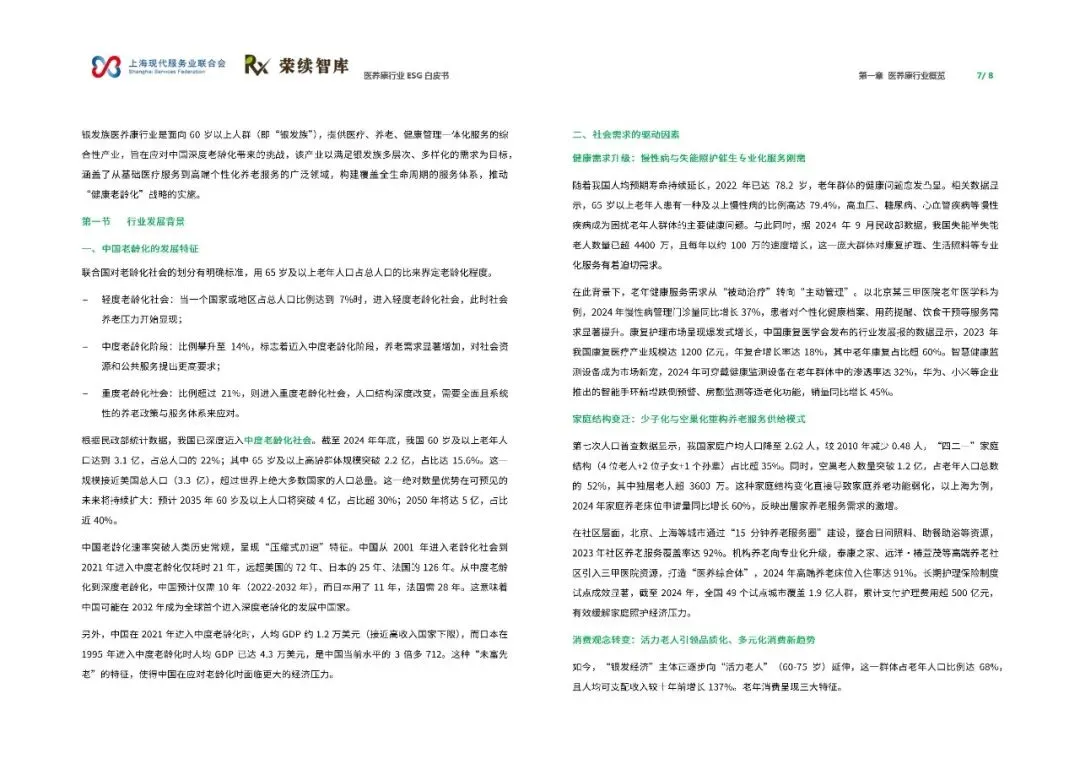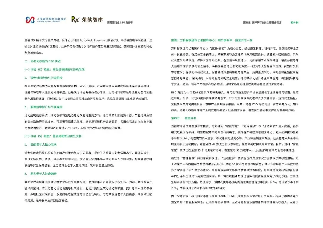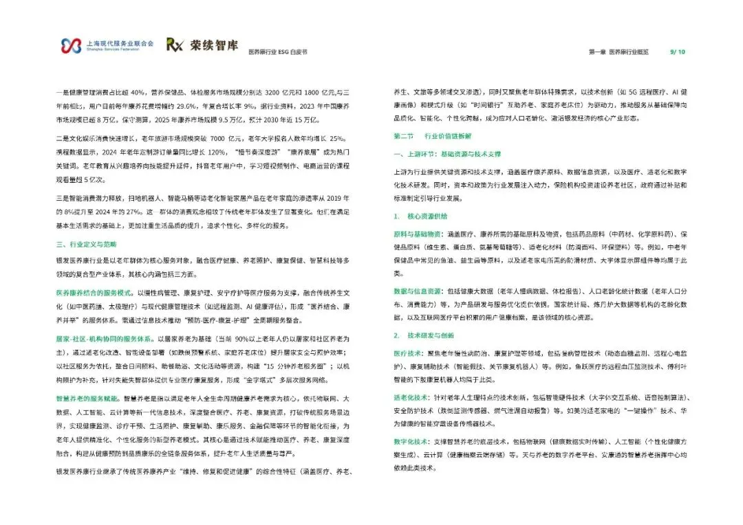 一是行业ESG基础框架,解析医养康行业发展沿革、价值链特征及国内外政策支持体系,聚焦绿色低碳转型、服务普惠公平、伦理治理与数据安全等核心议题;