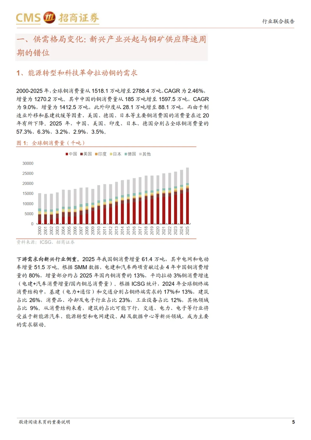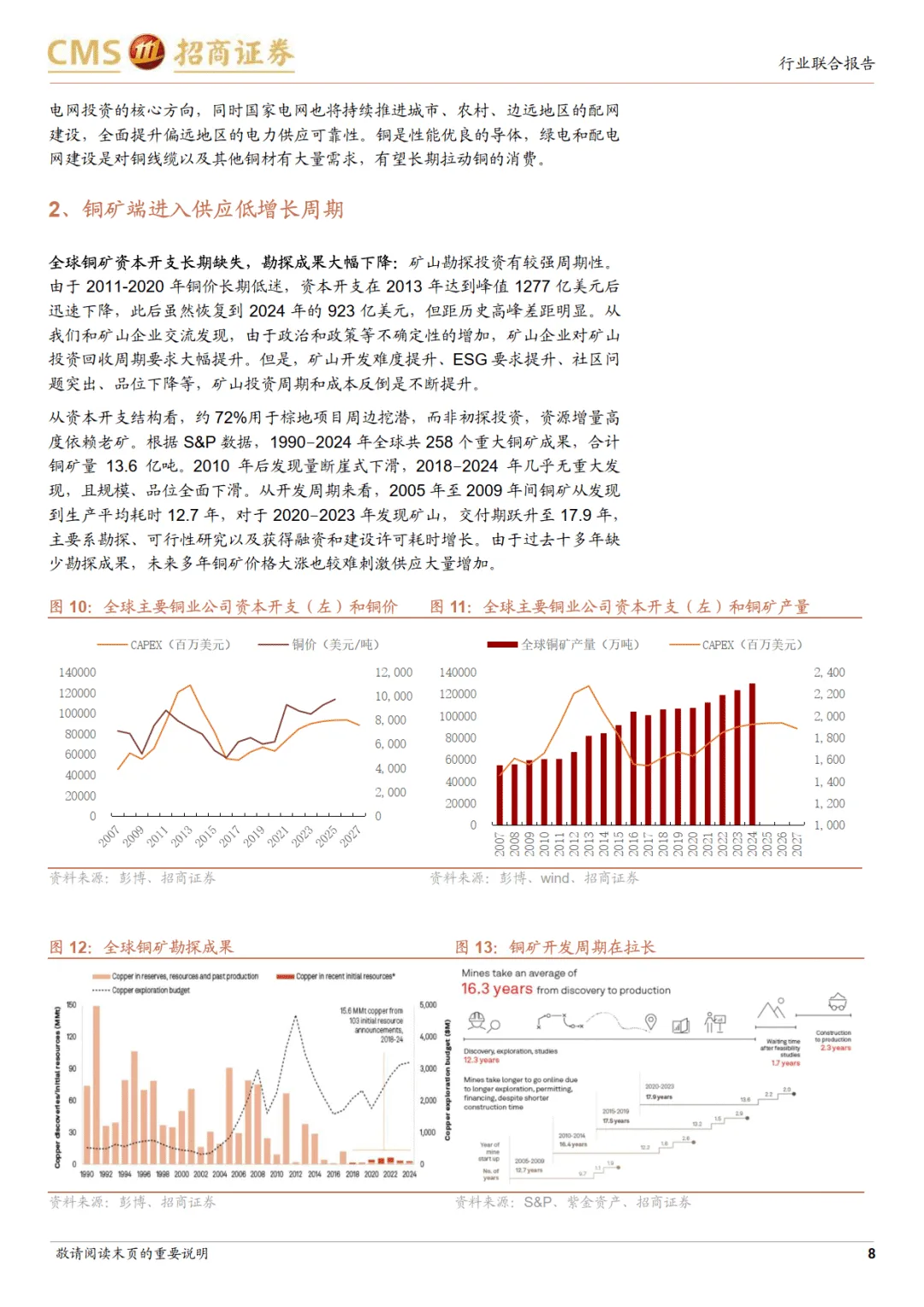 供需层面,铜市场呈现显著的长周期错配。需求端,能源转型、AI 发展、欧美电网重建及美国制造业回流推动电建浪潮,2021-2025 年电网和电动车贡献中国 80% 的铜消费增量,2025 年国内铜消费增量超六成来自这两大领域;全球流动性宽松及中美政策共振进一步提振下游需求,仅地产行业耗铜小幅下滑且后续下行空间有限。供应端,铜矿进入低增长周期,2013 年全球铜矿资本开支达峰值后持续低迷,新发现铜矿规模、品位下滑且开发周期从 12.7 年延长至 17.9 年,供应刚性凸显。同时,大国战略屯库加剧供需矛盾,全球铜库存处于历史 76% 分位数但非美地区仅 36%,美国因关税担忧出现铜库存虹吸;铜资源与冶炼的地域错配也增加了供应链风险,拉美、非洲贡献全球 57% 的铜矿产量,而中国占全球精炼铜产量 46%,长距离海运易受地缘影响。————