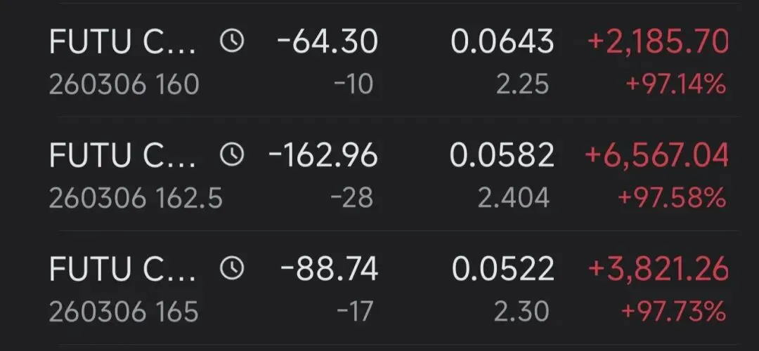 富途这周跌 3.6 点,收 143.46,空单全部上岸。下周四盘前发布财报,我猜业绩还是很强悍,这次是年报应该也会同时宣布分红,去年一股分两刀,今年能维持两刀就好。下周就 14 张空单了,要出财报不加空单了,希望出财报后起飞 ?